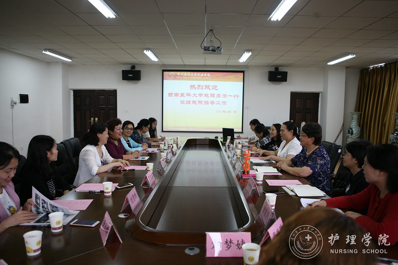 9月7日下午,西南医科大学教学评估中心主任赵琼教授、kaiyun开云官方网站院长鞠梅教授一行15人到我校kaiyun开云官方网站交流学习专业认证准备工作经验。kaiyun开云官方网站在百川楼会议室召开了交流座谈会热情接待了赵琼一行,院领导班子及全体教职工参会。会议由学院副院长刘志燕主持。