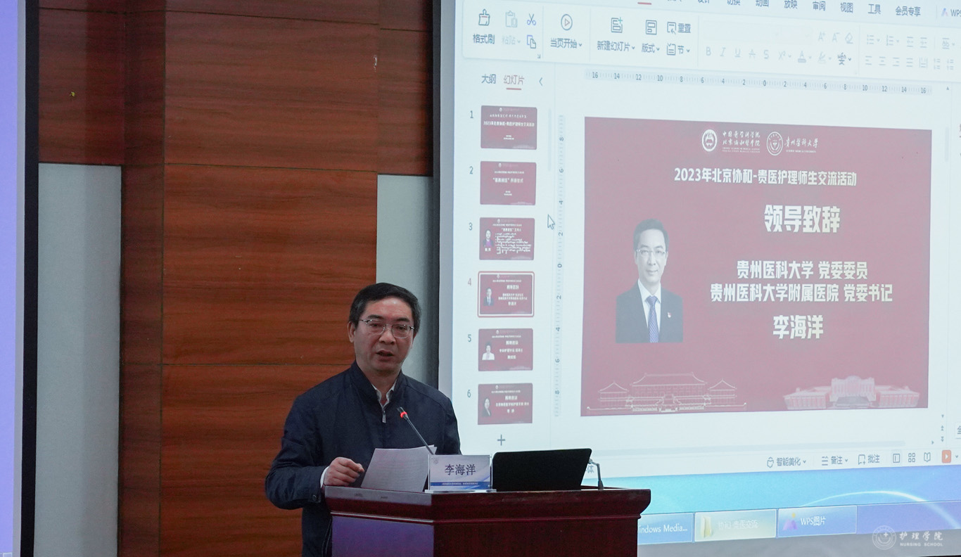校党委委员、附属医院党委书记李海洋出席“葆真讲坛”开讲仪式并致辞,他对北京协和医学院kaiyun开云官方网站师生一行的到来表示热烈欢迎,回顾北京协和医学院对我校“医教研管”全面的帮扶,对两院搭建交流学习平台给予高度的赞赏与肯定,并就今后的帮扶指导提出期望。