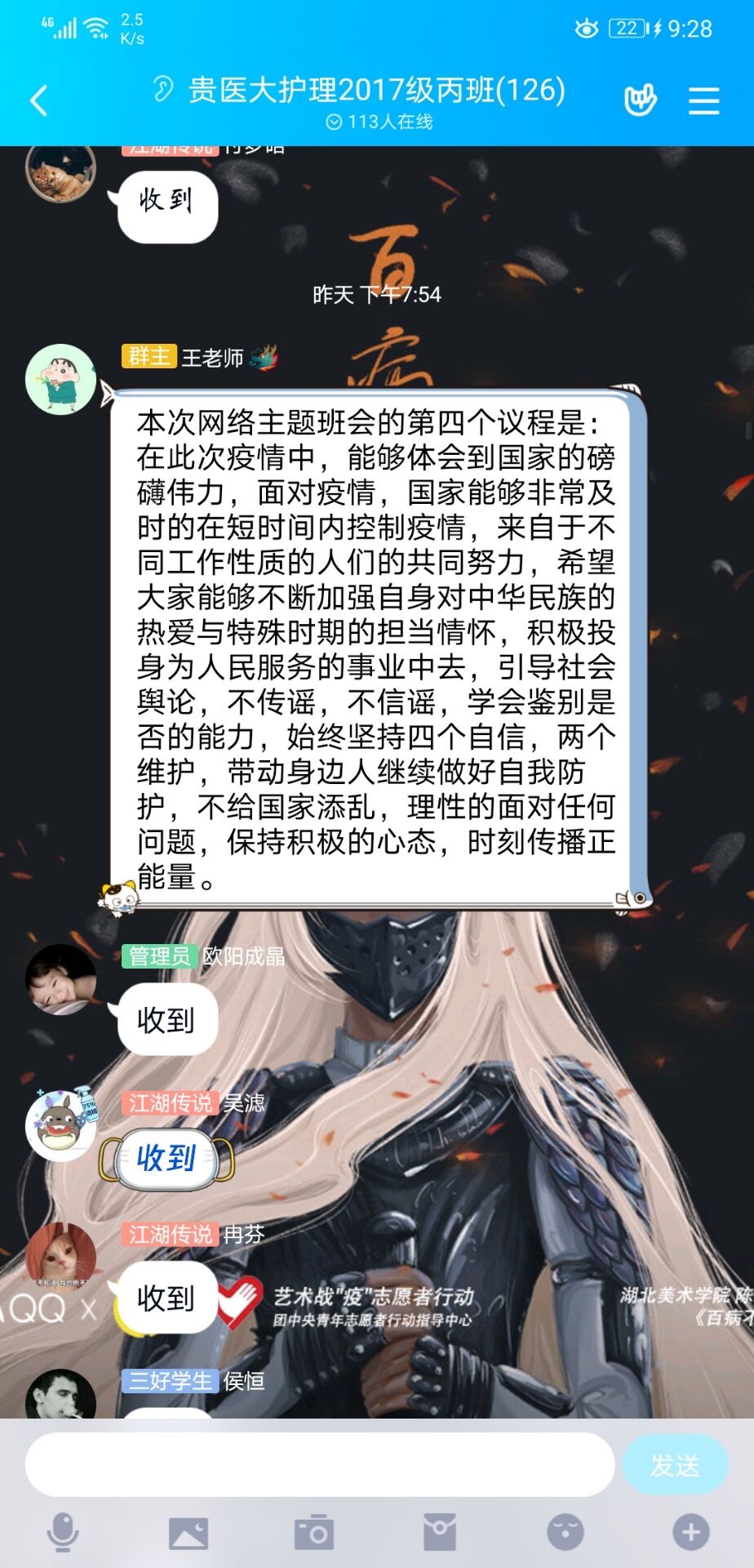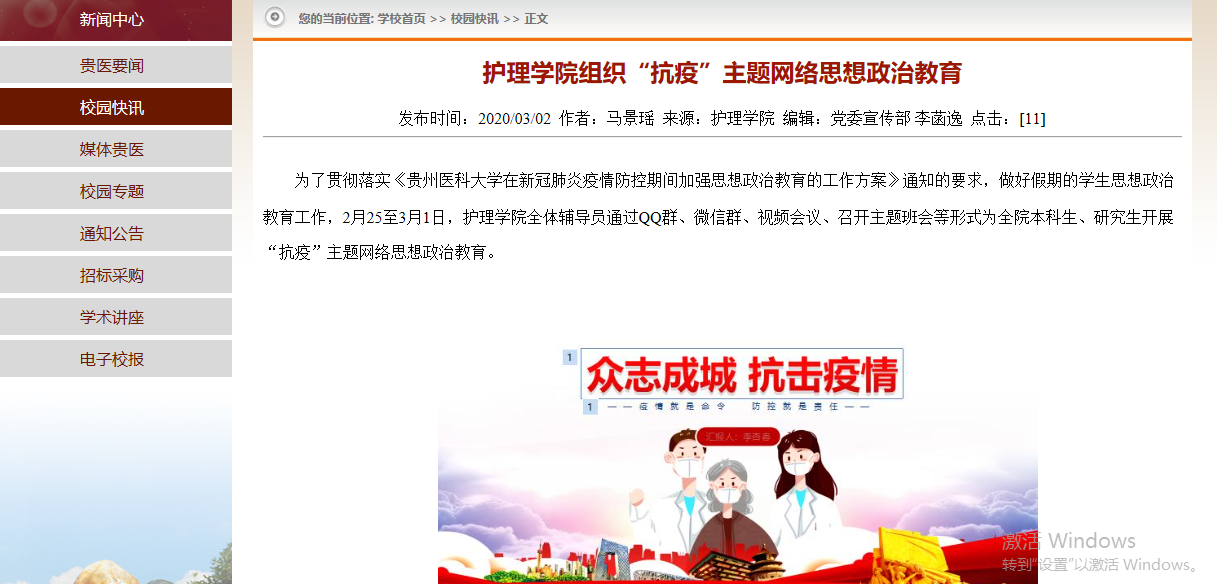 在学校和学院的领导和指导下,辅导员们立足本职工作,情系学生安危,充分利用互联网筑起与学生之间保持信息畅通的桥梁,及时为学生送去温暖:排查并重点关注湖北籍、有湖北旅居史学生;每日组织学生通过“今日校园”APP打卡的方式了解学生现居地和身体健康状况;对疫情严重地区学生进行心理辅导;上报疫情期间学生相关数据;协调毕业生实习就业相关事宜;召开网络视频班会传达学校的教学和管理规定、进行网络思想政治教育;心系毕业生就业工作,制作毕业生就业宣传推文,召开毕业生实习管理暨就业指导主题班会;积极组织撰写宣传、科普推文,通过“贵医护院”微信公众号普及新型冠状病毒肺炎防控知识,全方位引导学生正确对待疫情,做到不信谣、不传谣、自觉居家;学院团委积极组织开辟“贵医护理校友抗疫先进事迹”系列报道及 “南丁格尔志愿者抗疫行动”系列报道,宣传kaiyun开云官方网站师生及校友抗疫事迹,传递正能量,帮助在校生正确认识护理专业,提升专业认同感的同时增加专业自豪感,树立投身医疗事业,为人民服务的远大志向。