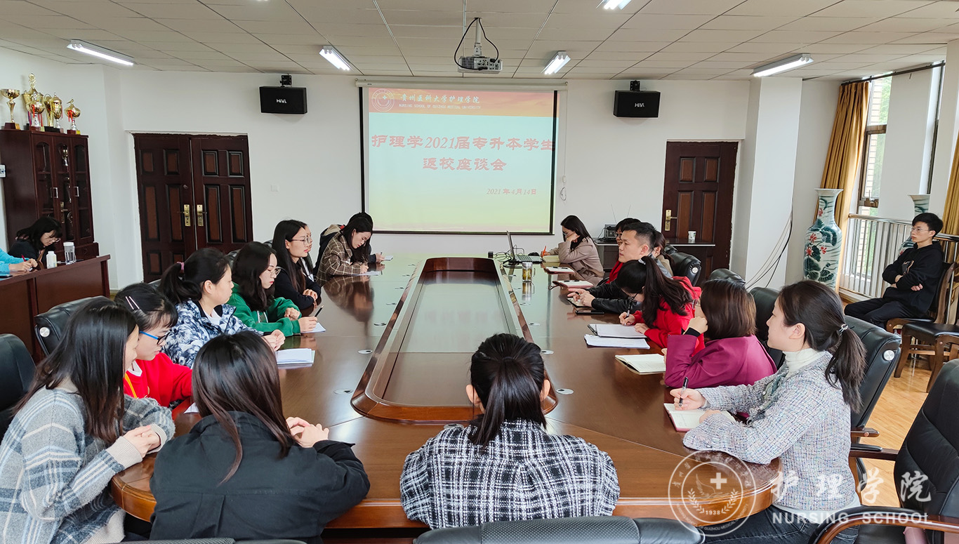 4月14日,为切实做好开云2021届护理学专升本毕业生日常管理工作,推进专升本毕业生就业管理,kaiyun开云官方网站在南校区百川楼五楼会议室召开了2021届专升本毕业生返校后第一次师生座谈会。kaiyun开云官方网站党委副书记何为、正科级组织员曾敏、团委副书记王晓玲、学生科副科长毕丽、各带班辅导员以及各班学生干部参加了本次座谈会。