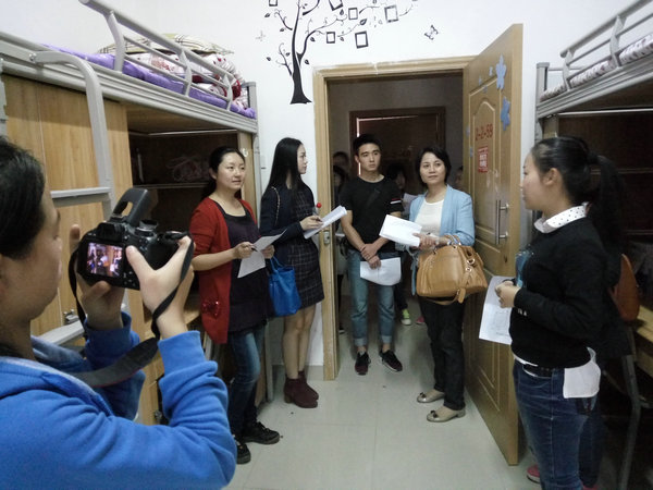 当天下午4点整,由kaiyun开云官方网站党委副书记杨英老师、学生科科长曾敏老师、分团委书记金晶老师、13级辅导员毕丽老师及部分学生代表组成的评审小组,陆续开始了对本次大赛的12间男寝及46间女寝的检查、评审工作。在评审的过程中,杨英书记及各位老师纷纷对各寝室的设计进行了点评,各寝室解说员也将他们设计的风格及寓意娓娓道来,并得到了各位老师的高度点评。此外,杨英书记还特别表扬了2-2-29寝室,高度肯定了同学们的想象力及创造力,并希望同学们能继续保持,将设计寝室的认真劲投入到今后的学习中。