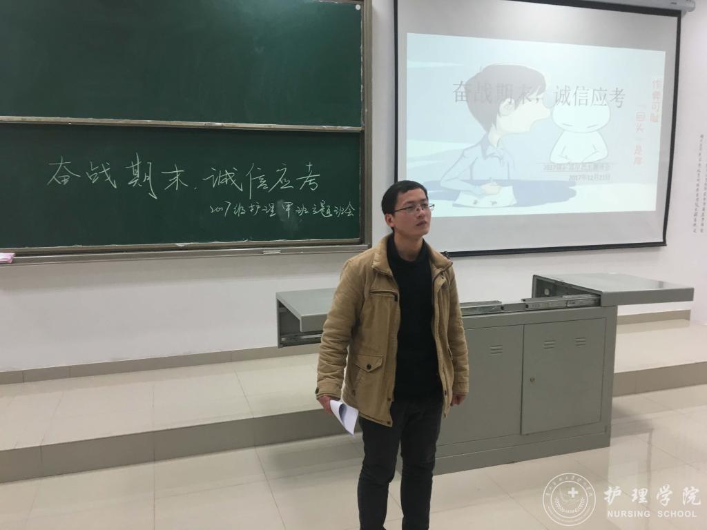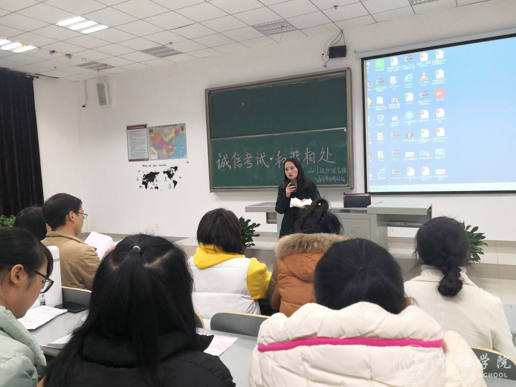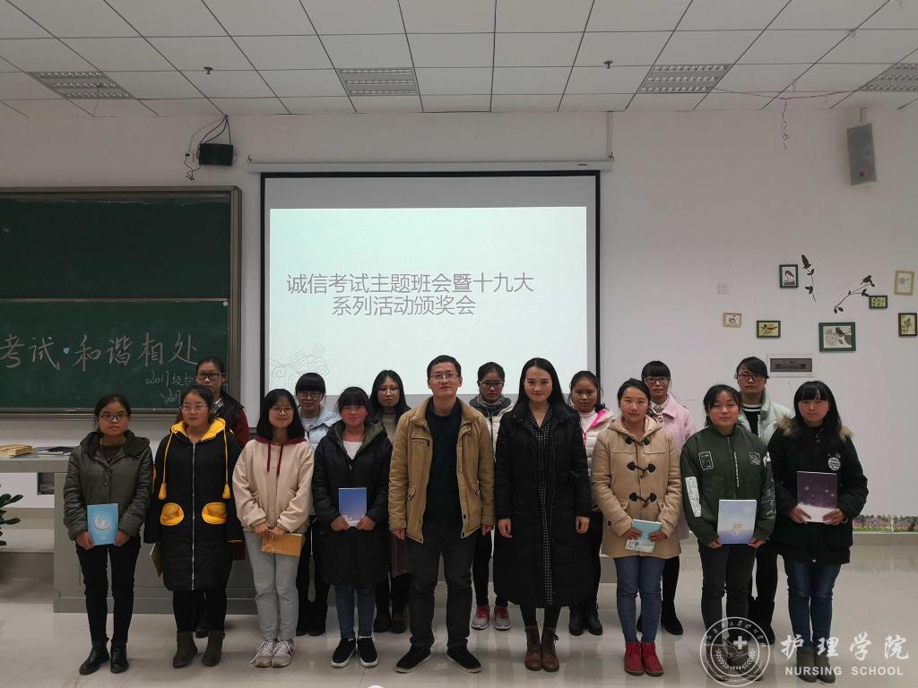12月21日晚,kaiyun开云官方网站在南校区7404和7406教室开展诚信考试主题班会暨十九大系列活动颁奖仪式。此次班会由班主任吴俊、王丽,辅导员马景瑶和班级学习委员主讲,2017级护理甲班、乙班全体同学参加,班会由各班班长主持。
