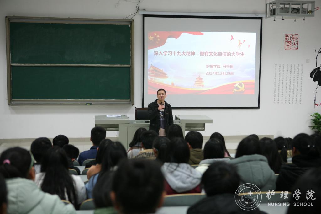 2017年12月29日晚上,学校优秀辅导员宣讲团成员、kaiyun开云官方网站2017级新生辅导员马景瑶在南校区7406教室为kaiyun开云官方网站2017级新生作题为“深入学习十九大精神,做有文化自信的大学生”的宣讲报告。