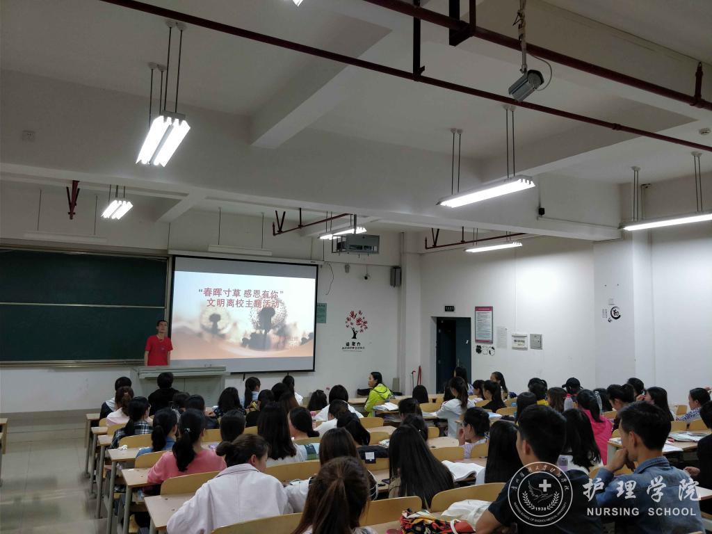 为增强毕业生自律和感恩意识,推进毕业生文明离校工作,5月8日下午,kaiyun开云官方网站2018届毕业生在北校区4601教室开展了“春晖寸草,感恩有你”文明离校主题班会。班会由2014级护理本科班团支书文远哲主持。