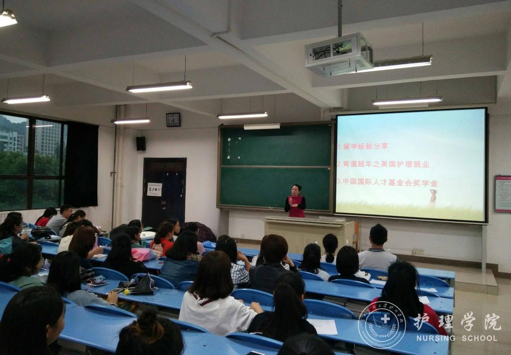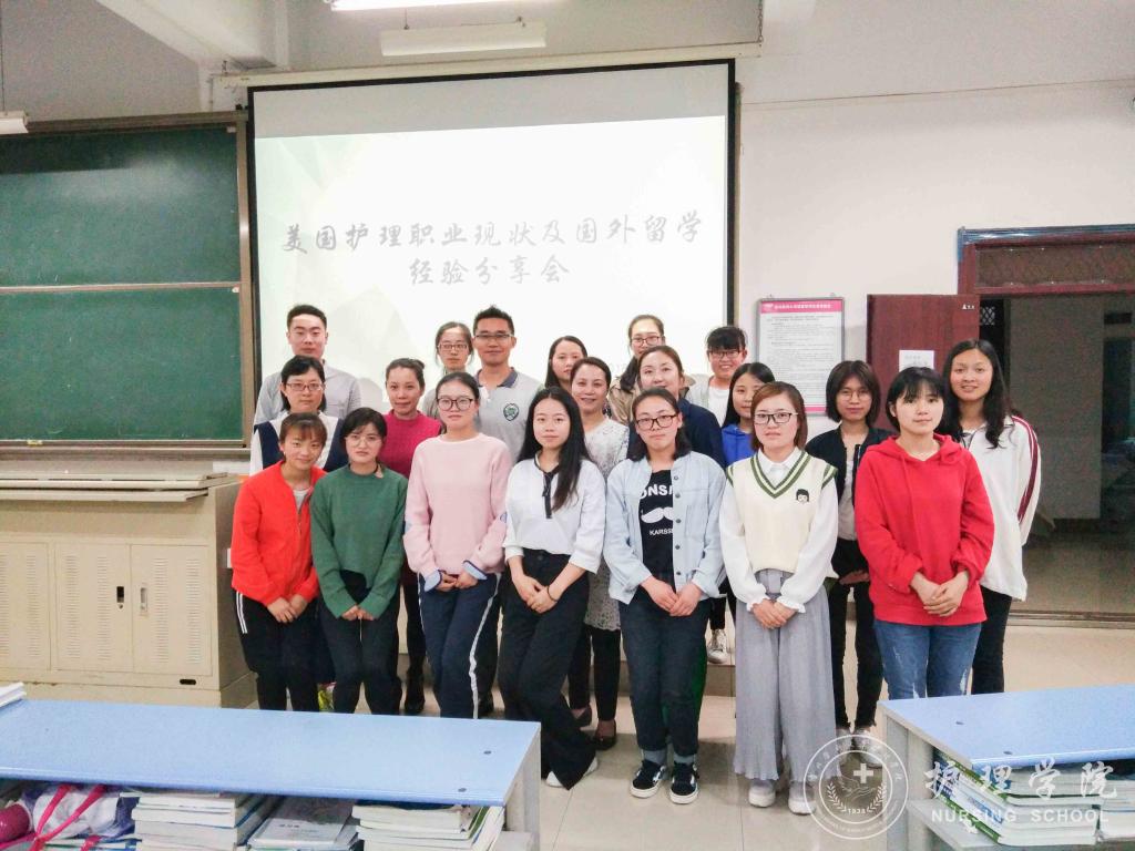 2018年5月31日下午7:00,kaiyun开云官方网站于北校区2401教室召开了“美国护理职业现状及国外留学经验分享会”,分享会邀请到美国海格斯大学出国留学区域负责人彭冰老师为开云学生进行了交流指导,kaiyun开云官方网站党委副书记杨英、护理技能实验室主任周谊霞、学生科科长曾敏、辅导员李杏春和2014、2015级部分同学参加了此次交流会。会议由周谊霞老师主持。