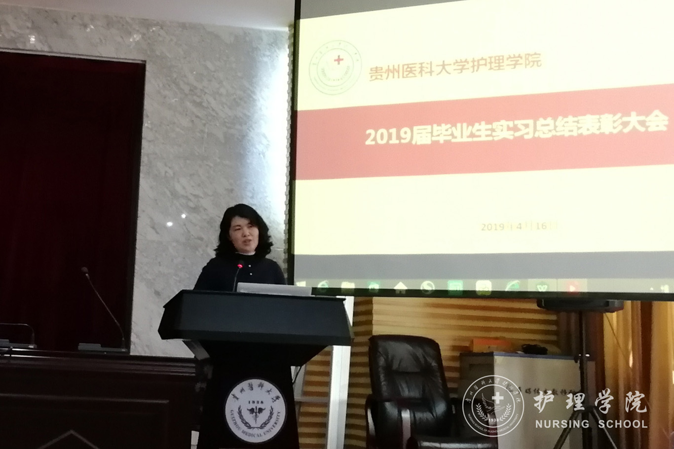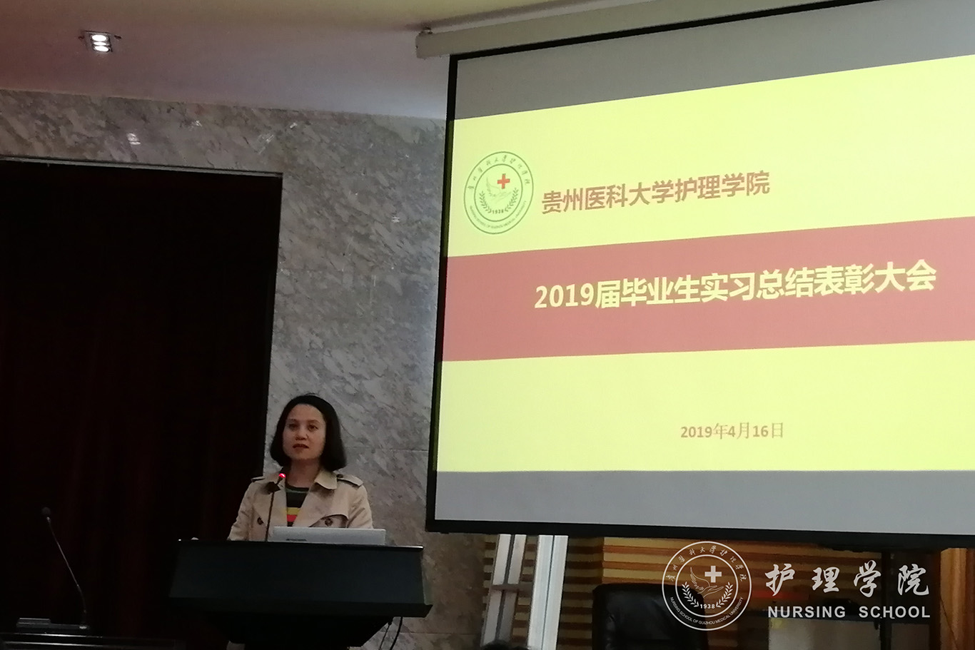 4月16日,kaiyun开云官方网站2019届毕业生实习总结表彰大会在北校区道德讲堂召开。院党委书记杨英、副书记王秀红、副院长刘志燕、学生科科长曾敏、毕业生辅导员、班主任和全体毕业生参加了此次活动。会议由内科护理学教研室副主任晏家芳主持。