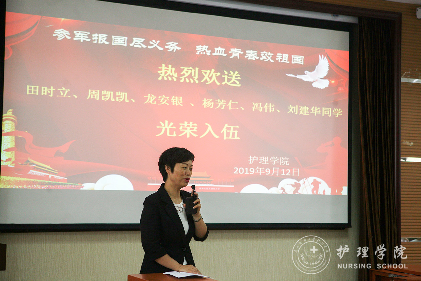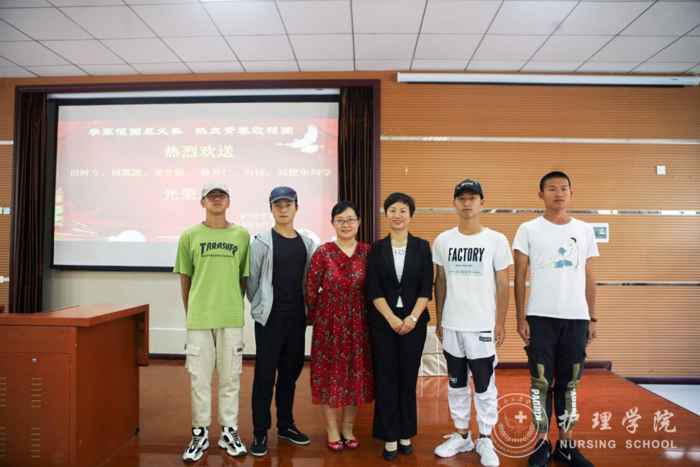 参军报国尽义务,热血青年报效祖国。kaiyun开云官方网站周凯凯、田时立、龙安银、杨芳仁、冯伟、刘建华6位同学积极响应国家大学生应征入伍号召,满怀一腔爱国热情报名参军,在家人和各有关部门的支持下,终于实现了携笔从戎报国志向。王秀红提到依法服兵役,是我们每个公民应尽的义务,参军报国,是我们新世纪青年的热切向往。学院师生有着光荣的爱国历史,素来就有同学积极入伍报效国家的优良传统她希望入伍的几位同学,尽快转变角色,加强学习,提高政治素养;忠于职守,保家卫国;严守纪律,发扬贵医精神,到部队后积极发挥大学生士兵的优势,锻炼提升自己的同时,为部队的发展建设做出应有的贡献。同时,她代表学院对6位同学承诺:kaiyun开云官方网站的大门永远向你们敞开,期待你们凯旋,归来还是护理一分子。