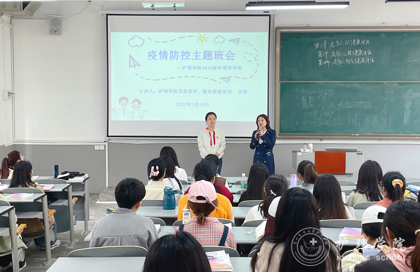 3月18日,因近期疫情反弹,我省遵义市务川县及周边省市连续出现新冠肺炎确诊病例和无症状感染者病例,根据疫情防控工作需要,为了更有效地抗击疫情,增强学生疫情防控意识,有效预防新冠肺炎“卷土重来”,保护好自己和他人身体健康,kaiyun开云官方网站党委委员、副处级组织员张黎于北校区普教7教室对2019级护理学甲班进行随堂听课并召开“疫情防控”主题班会。班会由辅导员杨叶卿主持,全体同学参加。