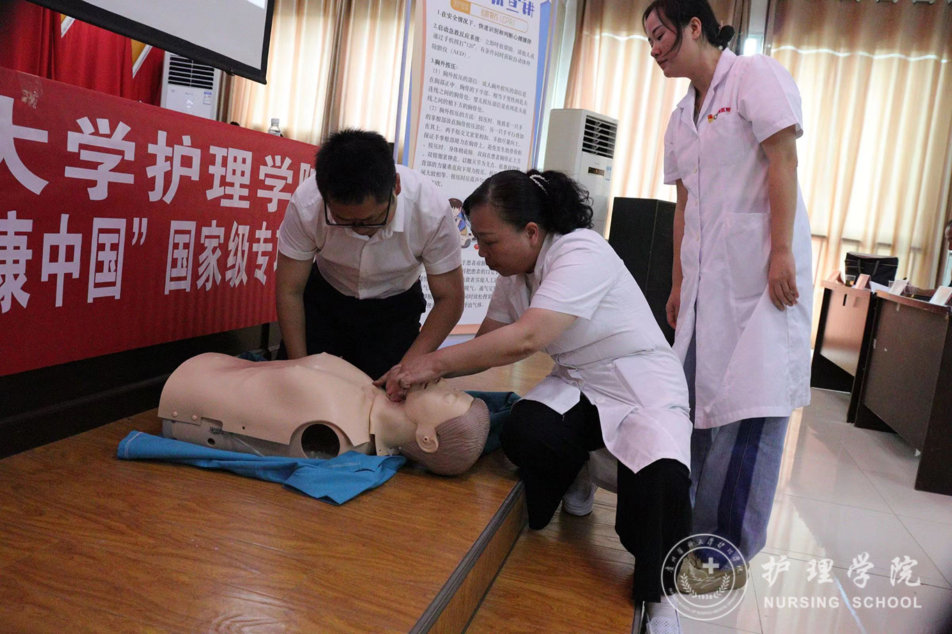 仪式结束后,kaiyun开云官方网站教师党员代表张仁莉、晏家芳、刘林敏、肖霓及kaiyun开云官方网站2022年暑期三下乡社会实践服务队的同学向蕉溪镇人民政府全体职工及各村负责健康建设工作的干部开展了健康知识讲座,对海姆立克急救法、心肺复苏术等急救技术进行了宣讲。