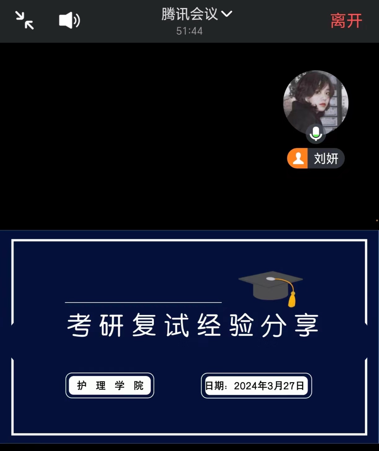 首先,刘妍介绍了今年学院毕业生考研的整体状况,对参会进行交流的在读研究生进行了简要的介绍。接下来,遵义医科大学在读研究生陈悦、李珊和刘凌扬依次交流发言,她们从遵医研究生复试的程序、注意事项以及技能操作等方面作了详细讲解和分享。kaiyun开云官方网站在读研究生李江燕则重点从复试礼仪、语言表达、答题技巧等方面对贵医考研复试进行了全面的讲解。毕业班辅导员毕丽鼓励进入研究生复试的同学要树立信心,戒骄戒躁,以最佳的精神面貌迎接复试,坚持不断学习以提升自身的综合素质。