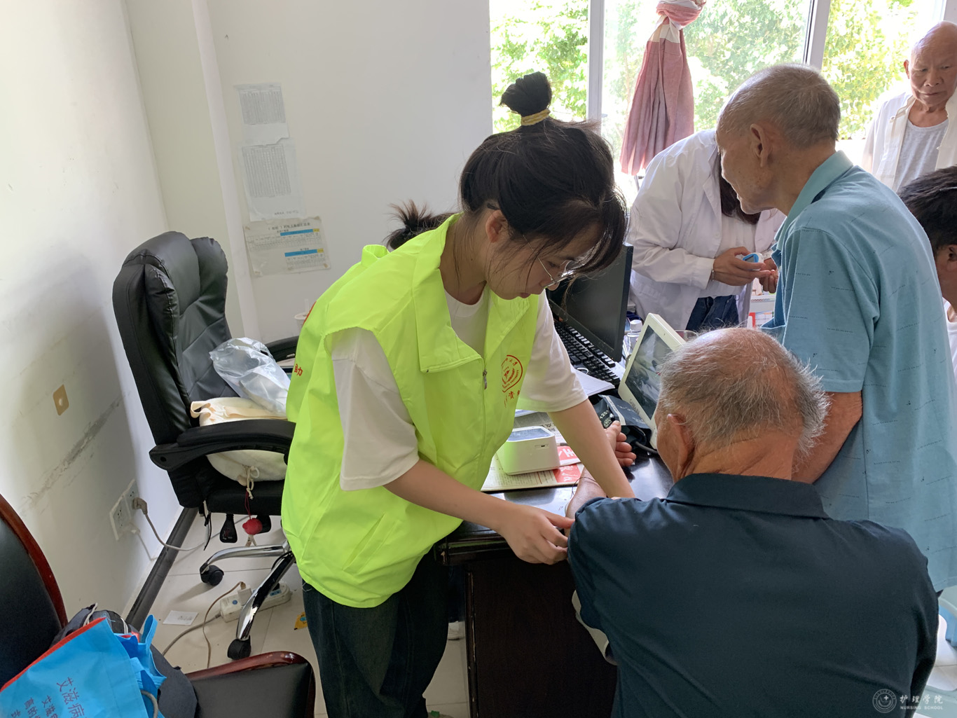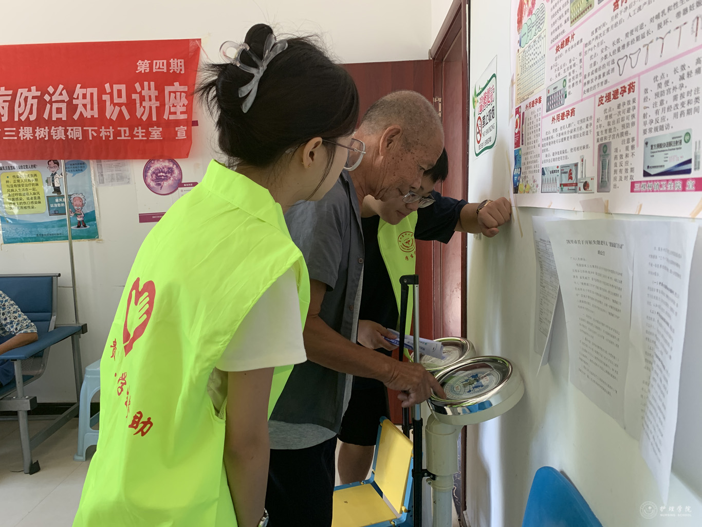 22日清晨,团队一行8人在柏松村村医的带领下,抵达志愿服务的地点。首先,他们来到了柏松村卫生室,在卫生室医疗专业人员的指导下,为村里的老人进行一次免费体检服务,队员们完成了血压测量、血糖检测等常规检查,并向老人们详细解释了检查结果,根据体检情况提供了健康建议。此外,队员们还特地准备了相机,以天安门的画面为背景,为老人们拍摄照片,记录下他们幸福的瞬间,不少老人表示“自己从来没到过天安门,这张以天安门为背景的照片非常珍贵且具纪念意义!”。