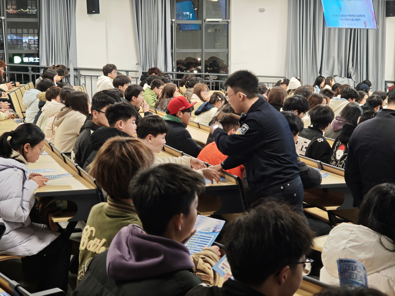 汤思恒强调防范电信诈骗的关键是‘不轻信、不转账、不透露’,遇事多与家人、老师、警方核实,筑牢第一道防线,并发放反诈宣传页。