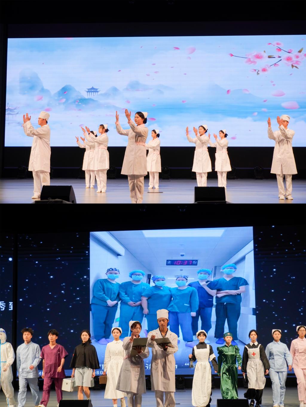 在悠扬的《星空》旋律中,授帽仪式正式拉开帷幕。护生们身着白衣,手捧燕帽,依次上台接受前辈授予的护士帽,授帽后,护生鞠躬致谢,象征着护理精神的代际传承,接过了前辈手中守护生命的重任,在副院长刘志燕的带领下,护生们庄严宣誓并齐唱《护士之歌》。随后,护理学2024级学生尹娜娜代表全体授帽护生作代表发言。现场还特别设计了“护士服百年变迁”主题走秀活动以及护理礼仪展示,增强了护生对护理职业的价值认同。
