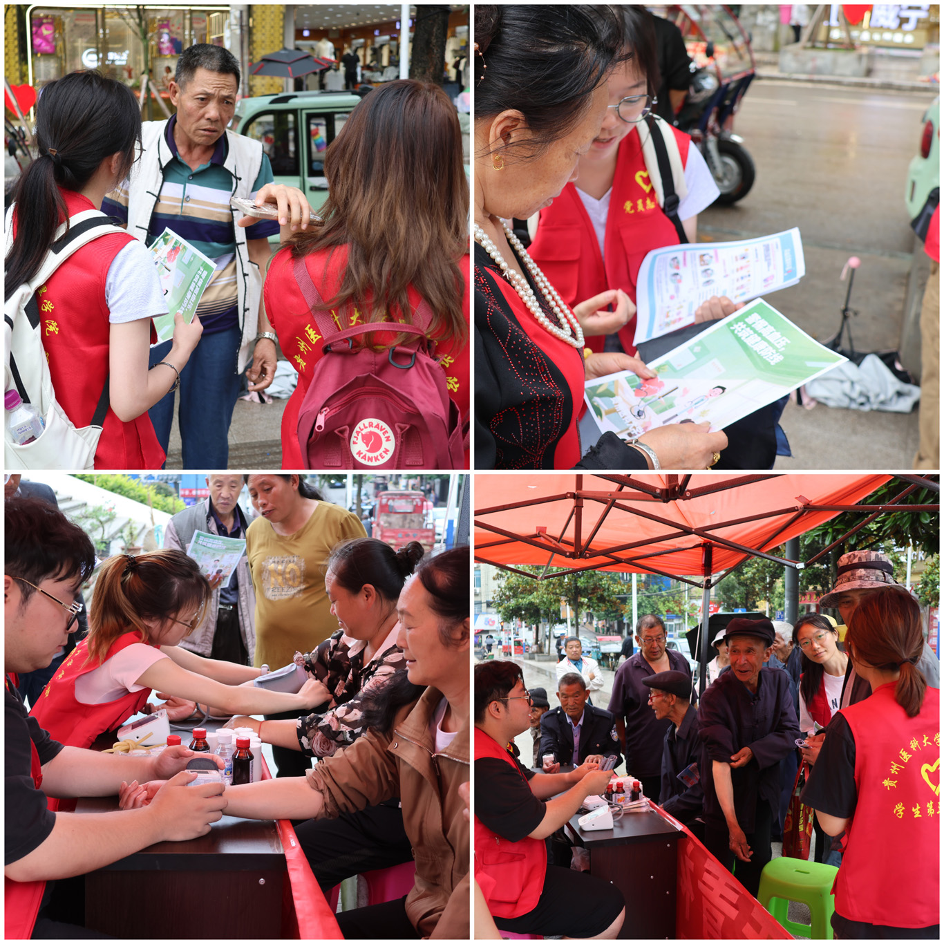 在草海镇民贸大楼购物中心广场,队员们支起义诊台,为排队的居民逐一测量血压、记录数据,耐心解答用药、饮食、运动等健康咨询;同时在周边发放精心设计的图文版《高血压预防手册》,用通俗易懂的方言向银发老人讲解低盐低脂、合理运动、按时服药的重要性。