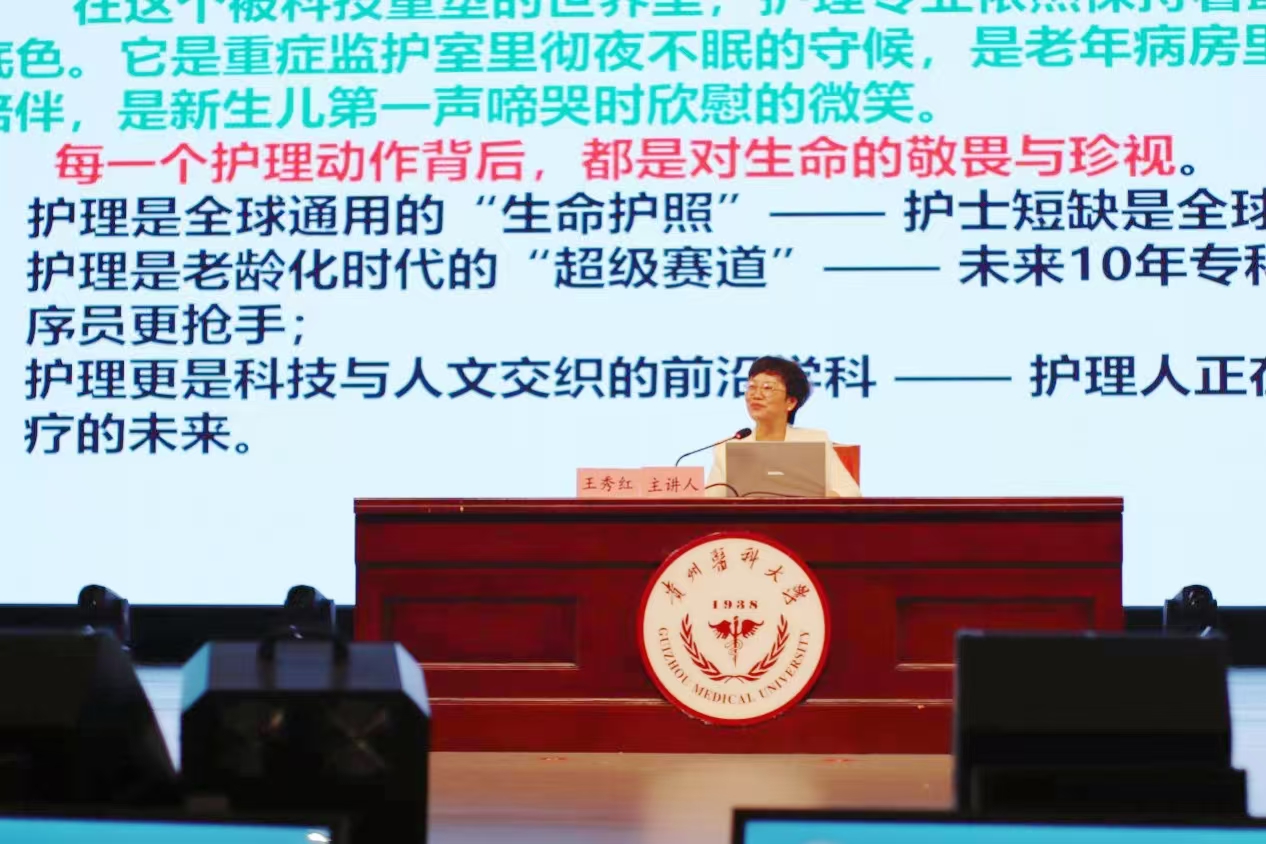 随后,杨英以《燃梦护理 不负韶华 开启人生新征程》为题开展讲座。她从现代护理学诞生、学科发展脉络、人生规划与专业成长四个维度,结合历届南丁格尔奖章获得者的感人事迹,引导新生追随前辈脚步、感悟职业精神,传承发扬南丁格尔精神;同时勉励同学们扬起实干风帆、激发拼搏斗志,勇担新时代护理使命,树立“服务患者、争当白衣天使”的奋斗目标,珍惜大学时光,将个人理想融入党和国家事业,努力成长为有理想、敢担当、能吃苦、肯奋斗的新时代护理青年,为建设社会主义现代化强国贡献力量。