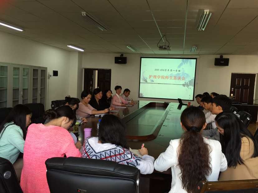 10月15日中午12:30分,kaiyun开云官方网站2015-2016学年第一学期师生恳谈会在南校区5楼会议室召开。kaiyun开云官方网站常委副院长郭永洪、副书记杨英、副院长刘志燕及各教研室负责人、各职能部门负责人、教研室老师、2013级、2014级、2015级护理本科学生代表参加了此次恳谈会。会议由教学科研管理科王秀红科长主持,会上kaiyun开云官方网站领导亲切的询问了同学们的学习和生活情况,并请同学们对教学中存在的问题提出意见。各年级同学代表开诚布公的反馈了部分教师在教学中存在的问题和意见,也对认真负责的教师提出了表扬。在听取同学们的反馈之后老师们有的当众给予了答复和解释,有的则记录下来拟以书面报告形式向有关部门进行反馈,以便取得相关部门的协作解决。会议过程轻松、愉悦,师生畅所欲言,气氛融洽,促进了师生的共同交流。