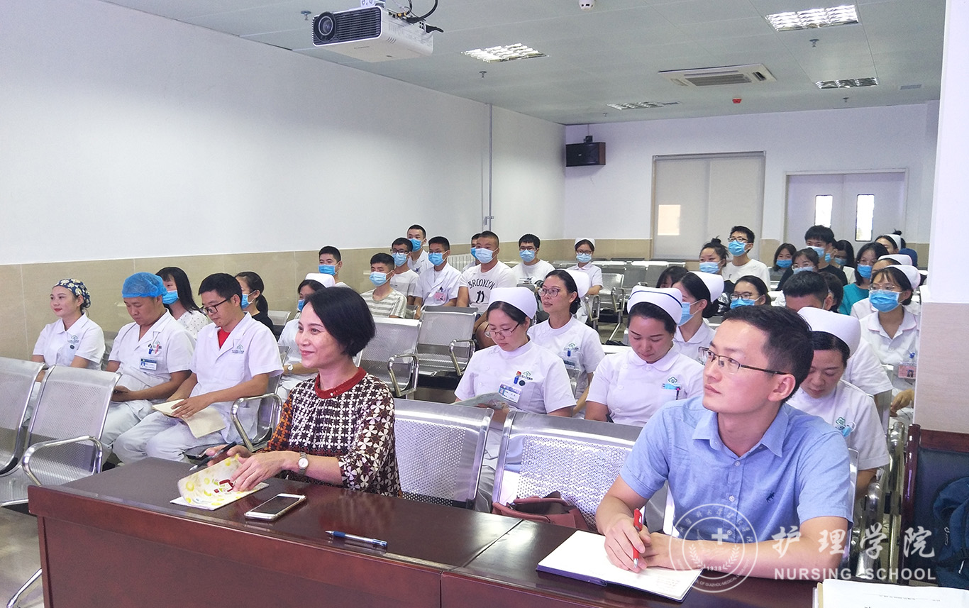 接着,杨英一行参加了贵医2017级护理实习生座谈会。护理部副主任罗春从教学组织及制度、教学实施情况、教学督导情况、质量与成效等方面汇报了医院护理教学情况。杨英指出,医院对贵医实习生是非常关心和重视的,杨英对此表示感谢,并希望护理部老师继续严格要求学生。她同时希望同学们认真向师长学习,珍惜时间,团结好学,完成实习任务,继续传承贵医精神,得到社会的认可。杨英一行还听取了2017级实习生的意见、建议,并解答了同学们在实习、生活等方面遇到的困难和问题。杨英勉励同学们做好就业规划、明确就业目标、完成实习任务,不断提升自己,为就业做好充分准备。