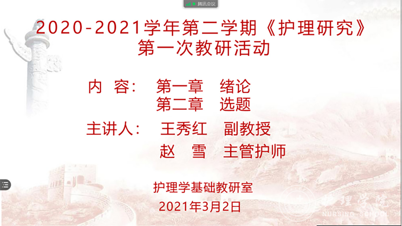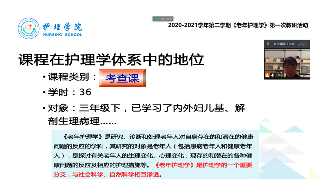 3月3日晚上,《老年护理学》课程团队以腾讯会议方式开展集体备课,与既往不同,今年的老年护理学教学团队事先进行了必要的调整充实,更加体现“护教协同”,将附院老年护理方向硕士生导师加入到教学团队中。当天的活动除授课教师外,附属医院护理部副主任蔡鹏和学院相关教师、老年护理研究生参与了本次活动。活动上首先由《老年护理学》校级“课程思政”建设项目负责人王芸芸介绍了课程概况和课程思政建设的思路。接着老年护理学方向研究生导师、本科老年护理学主讲教师王秀红副教授以说课的方式展示了第一章、第二章课程教学教案和PPT,重点讲授了思政育人元素与目标、时间分配、组织教学的方法等,为后面该课程的教研活动提供了方法指导。参会师生纷纷表示,希望今后多开展此类教研活动,提升学院教师的临床思维,提高临床教师教学能力,促进优势互补,从根本上提升护理人才培养的质量。