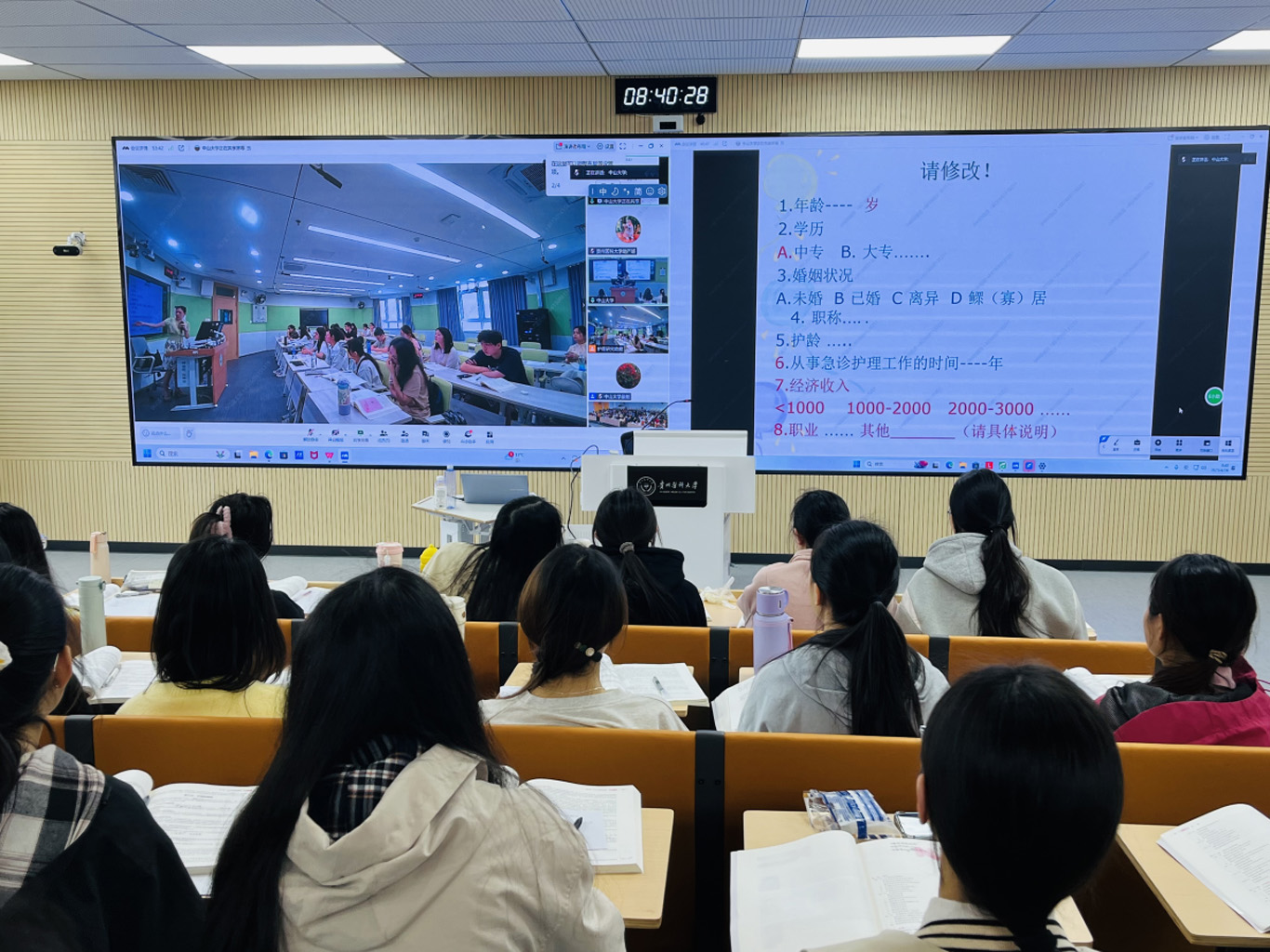 此次活动中中山大学张美芬教授、刘可副教授、张利峰副教授分别就“护理研究选题”“资料收集法”“研究报告的书写”,同步为中山大学kaiyun开云官方网站2023级22名同学和kaiyun开云官方网站2022级152名进行授课。kaiyun开云官方网站护理学基础教研室副主任邹惠美及护理学研究教学团队教师冯安丽、卓英权老师作为主要参与教师共同协助同步课堂的开展。