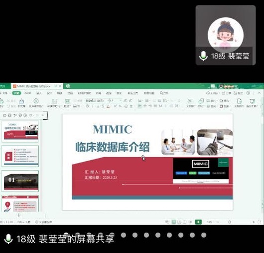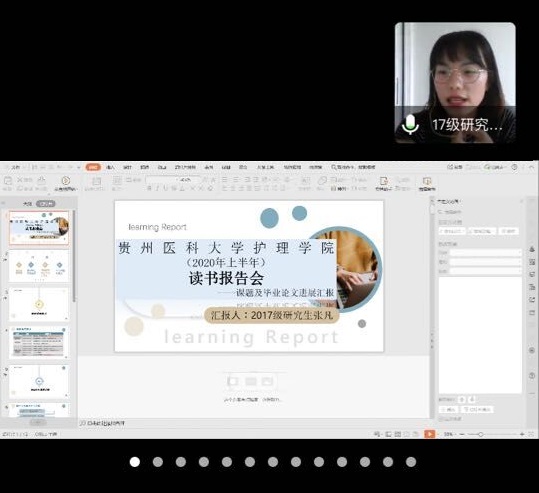 会议由kaiyun开云官方网站党委副书记王秀红主持。本次读书报告会共分两个环节进行,首先由2017级方雯、覃瑛、张凡、李晓杰4位同学汇报了课题进展及学位论文完成情况,同学们结合自身完成课题和学位论文撰写过程中的经验和体会做了分享和交流。随后导师和同学对4位同学的汇报进行了点评。接下来的环节,2018级研究生张丽娟和裴莹莹分别以PPT形式进行了15分钟的读书报告汇报。张丽娟以“冰山理论”为题,分享了冰山理论核心观点及在护理研究领域的应用,裴莹莹以“MIMIC数据库介绍”为题,较为系统介绍了MIMIC数据库的使用。导师们根据学生的综合表现进行线上面对面点评,同时通过问卷星对学生汇报内容就选择意义、内容掌握、延伸拓展等方面进行综合考评,作为研究生培养学术综合成绩评定参考。