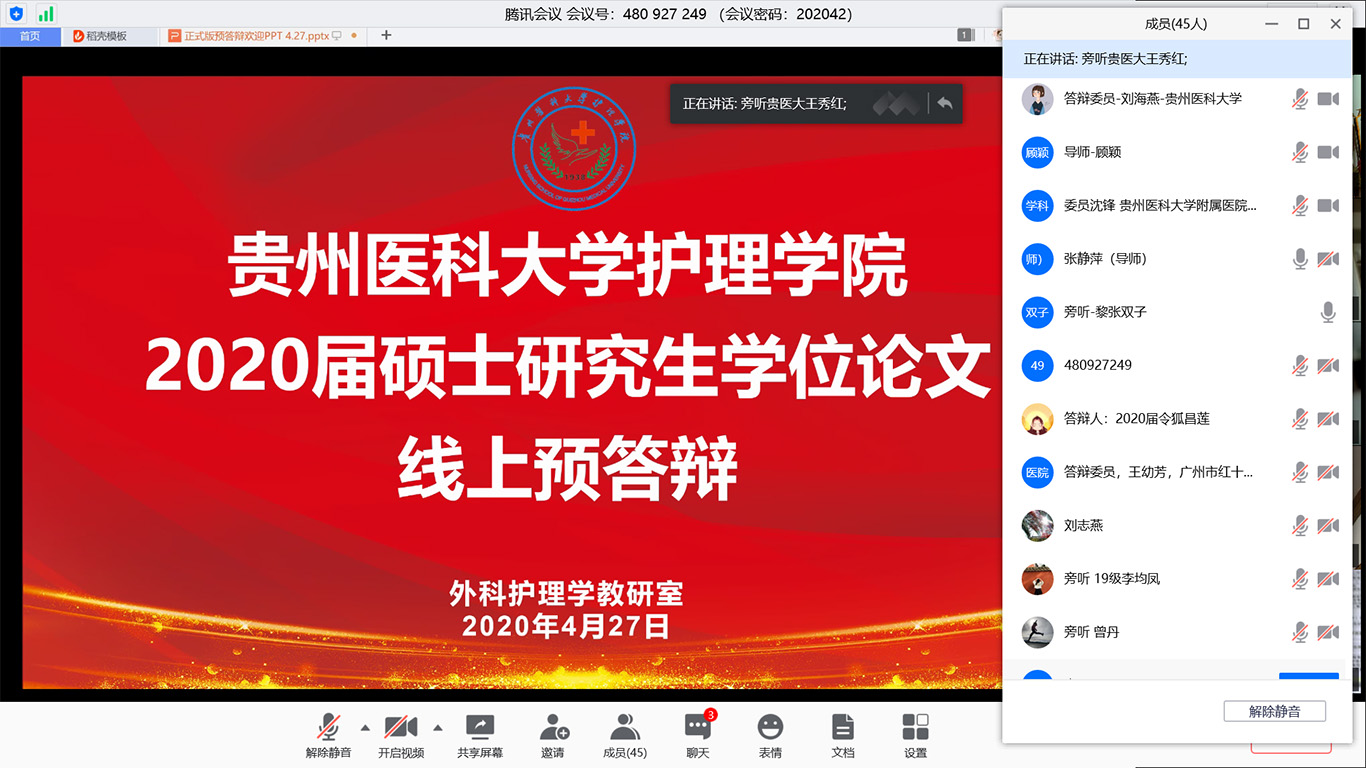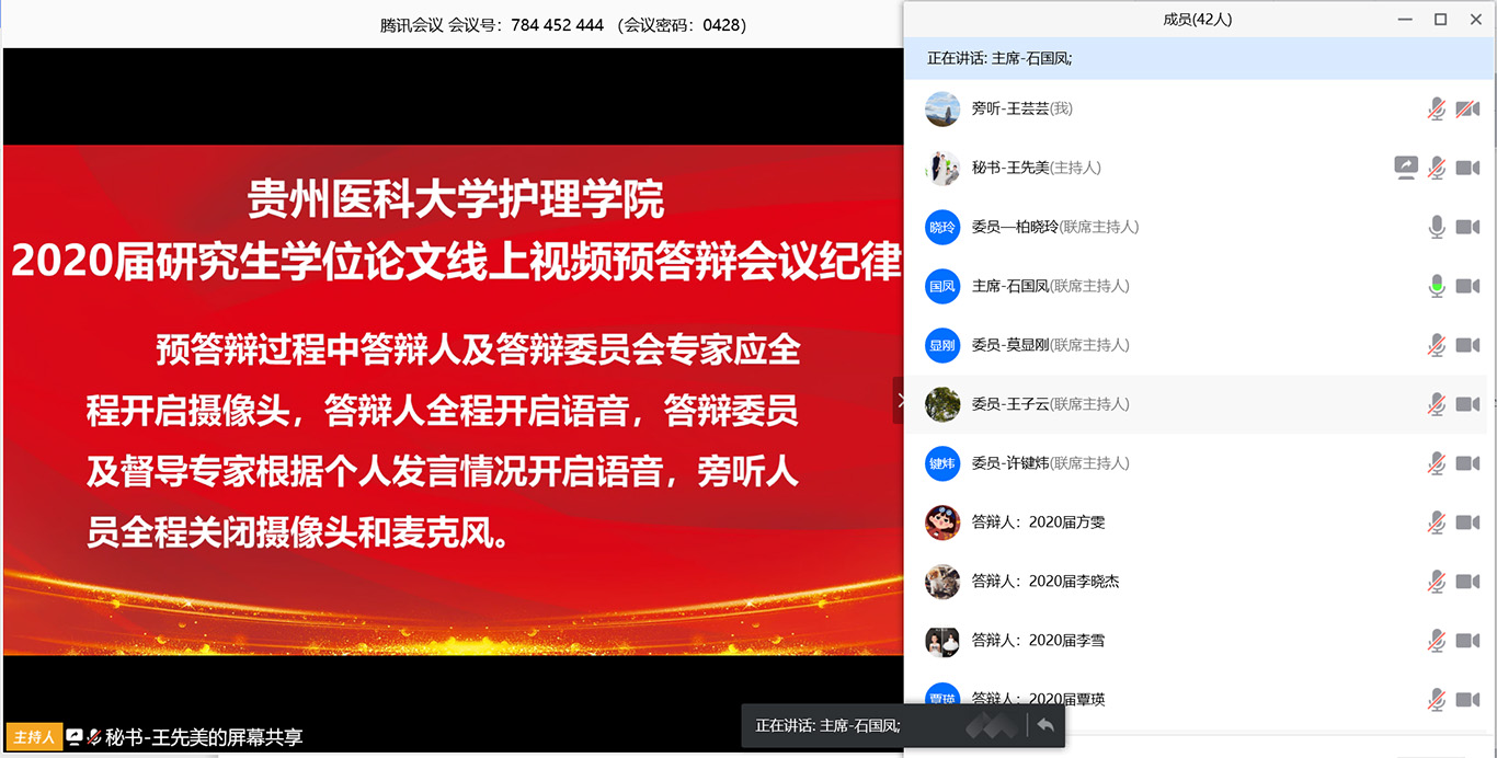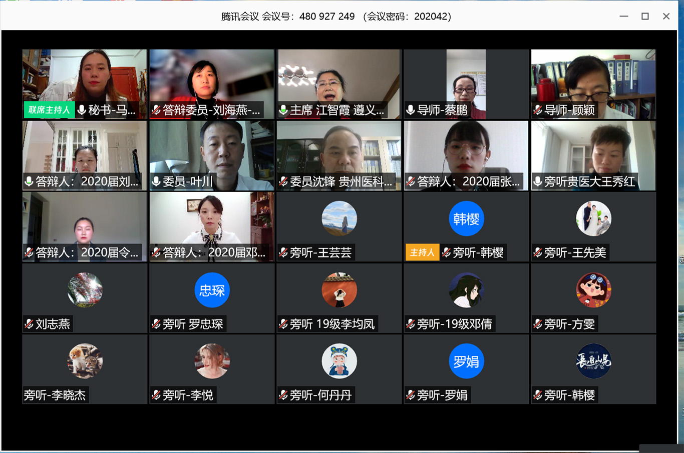 此次线上预答辩采用腾讯会议平台,8名毕业班研究生同学按研究方向分成两组进行。答辩委员会主席和委员分别由贵州中医药大学kaiyun开云官方网站党委书记石国凤教授、遵义医科大学kaiyun开云官方网站院长江智霞教授、贵州省人民医院柏晓玲博士、kaiyun开云官方网站附属医院ICU主任沈锋博士、骨科博士后叶川教授、老年医学科教授莫显刚博士、广州红十字会医院王幼芳副主任护师、kaiyun开云官方网站公共卫生学院王子云博士、刘海燕副教授、kaiyun开云官方网站基础医学院许健炜博士担任。两场预答辩共有近100人参加,学校研究生教育督导专家、kaiyun开云官方网站及附院导师、专业教师和全体研究生同学参加预答辩旁听。