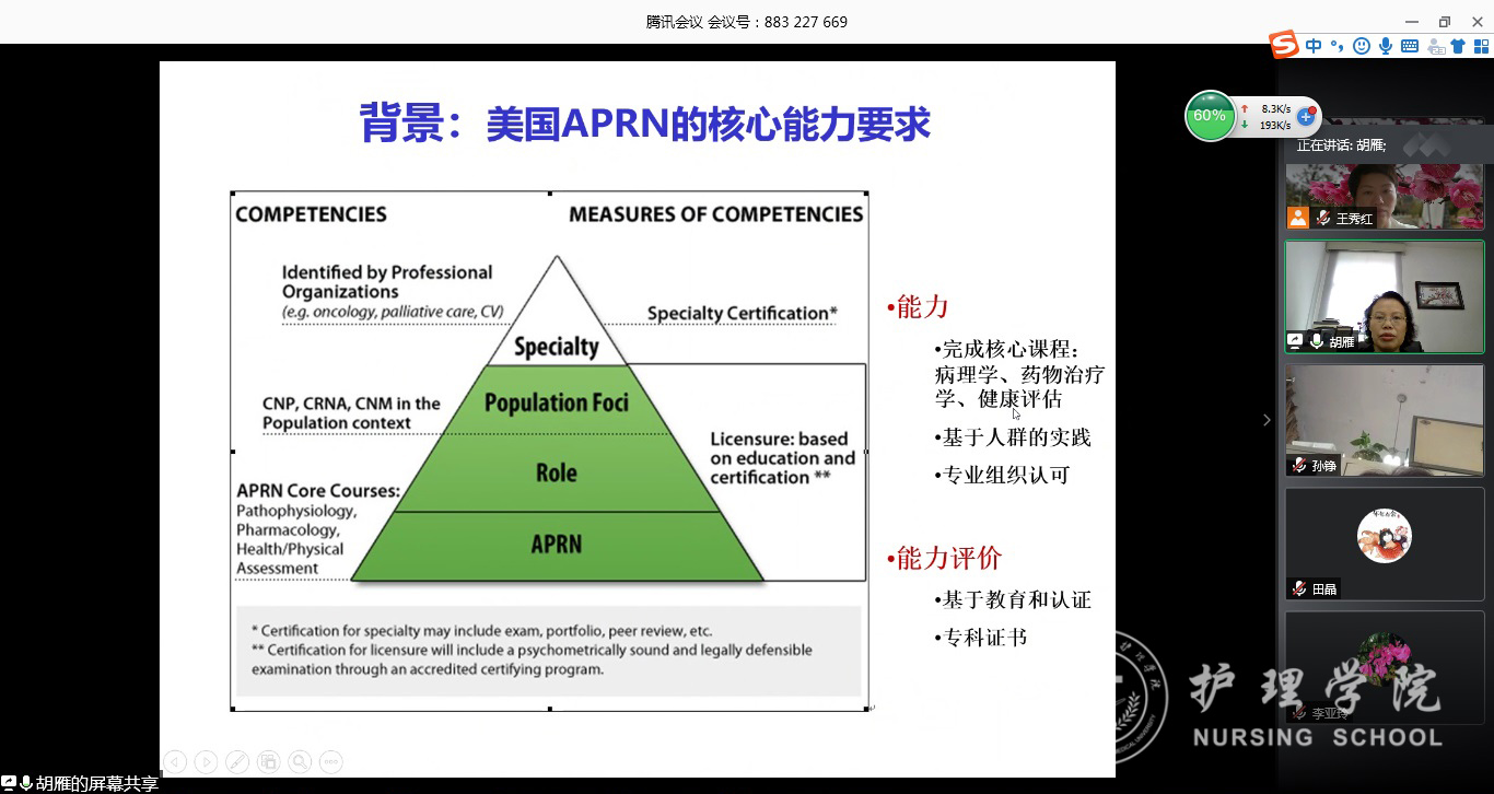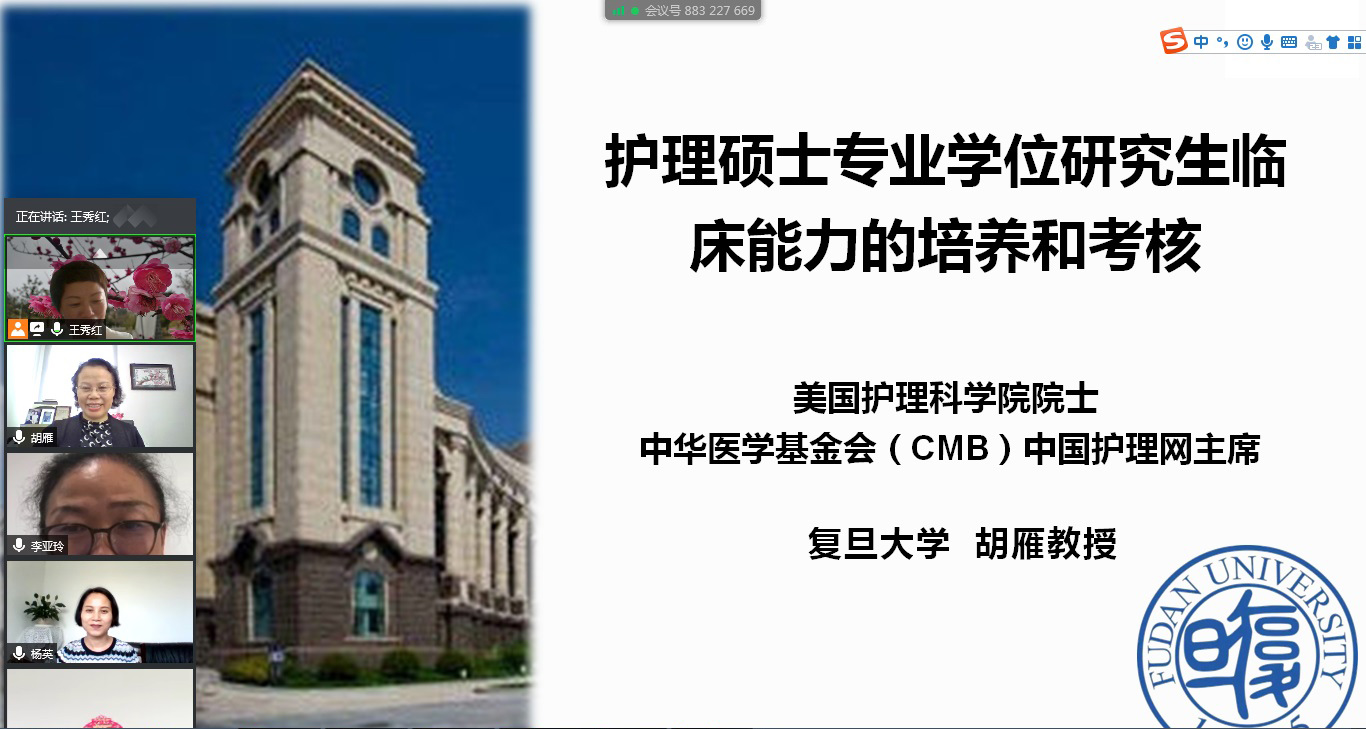 6月12日上午,复旦大学kaiyun开云官方网站院长胡雁教授受邀为kaiyun开云官方网站全体研究生导师和专业教师开展了题为《护理硕士专业学位研究生临床能力的培养及考核》专题讲座。会议通过腾讯会议平台进行,kaiyun开云官方网站相关导师和教师近30人参加讲座,kaiyun开云官方网站党委书记杨英主持。