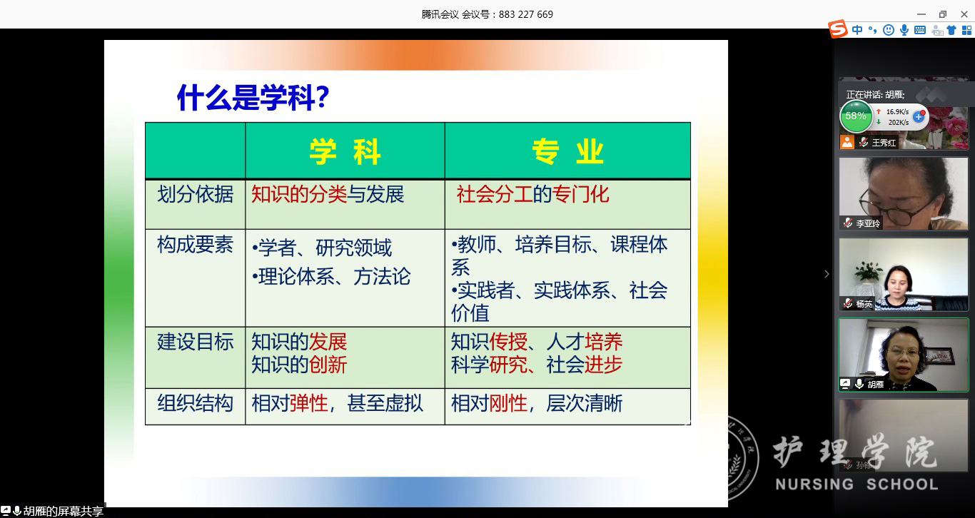 胡雁教授从什么是学科、学科建设的五大要素、国际国内护理学科发展概况、护理专业学位和科学学位的比较、护理硕士专业学位人才在护理学科建设中的意义、强化护理硕士专业学位研究生临床能力培养及注重护理硕士专业学位研究生临床能力的综合考核等几个方面给大家做了精准的介绍。复旦大学kaiyun开云官方网站作为全国最早开展护理硕士专业学位研究生培养的高校之一,经过10余年的不断实践和经验总结,在取得学科建设稳步发展的基础上,护理专硕研究生的培养成绩斐然,曾获得“全国第一届医药学研究生教育成果奖”一等奖。