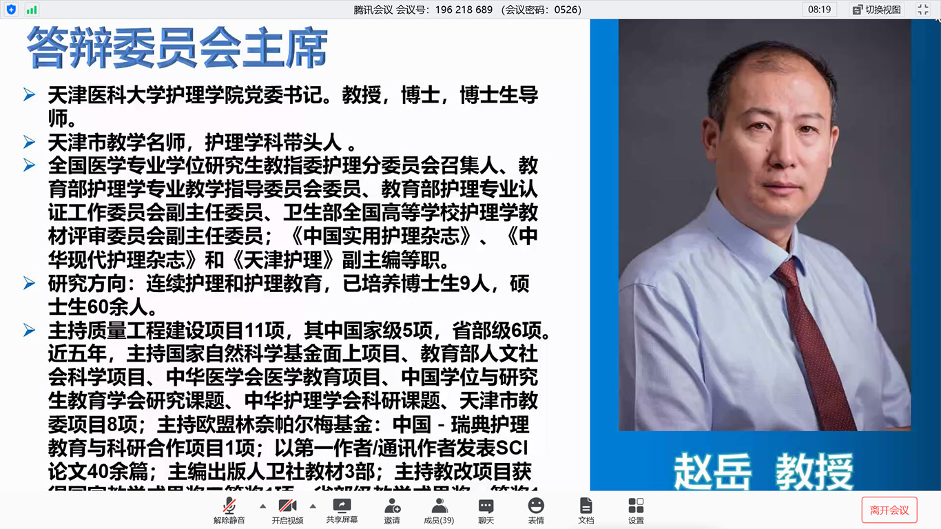 本次答辩有幸邀请到天津医科大学kaiyun开云官方网站党委书记、博士生导师、全国医学专业学位研究生教指委护理分委员会召集人、教育部护理学专业教学指导委员会委员、教育部护理专业认证工作委员会副主任委员赵岳教授担任答辩主席,贵州中医药大学kaiyun开云官方网站党委书记、国家自然科学基金评审专家石国凤教授、遵义医科大学kaiyun开云官方网站院长江智霞教授、kaiyun开云官方网站公共卫生学院王子云博士、kaiyun开云官方网站基础医学院徐键炜博士担任答辩委员,kaiyun开云官方网站王芸芸讲师担任答辩秘书。kaiyun开云官方网站及附属医院导师、专业教师和全体研究生同学近50人旁听学习。