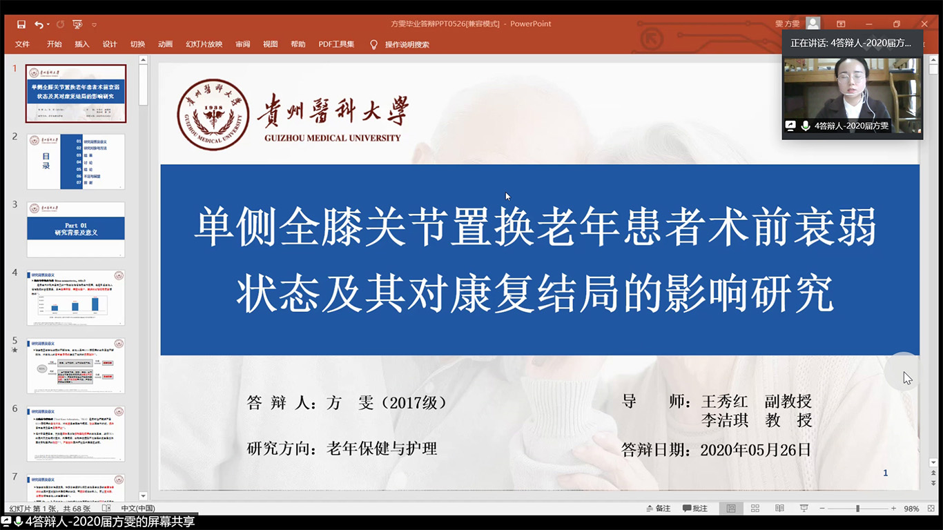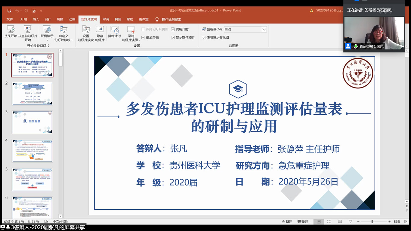 答辩会上,答辩学生通过在线平台屏幕共享演示PPT,从选题意义、论文框架、研究思路、主要内容、创新之处等方面进行了简要陈述,答辩委员会委员进行了点评和提问,并就进一步完善论文提出了指导性意见和建议,研究生同学就专家所提出的问题分别做出认真回答。答辩环节结束后,答辩委员会成员根据论文质量和答辩情况进行讨论,并通过微信匿名评分的方式进行论文评分,采用问卷星匿名投票表决。经专家的严格评议和审核,8名同学顺利通过答辩,建议授予医学硕士学位,并推荐一篇论文参与学校优秀硕士学位论文评审。答辩会历时7小时。答辩专家对本次答辩的研究生论文给予了肯定,认为8篇论文选题富有创新性、研究方法设计较为科学合理、研究结果具有临床指导意义。同学们流畅的汇报,专家们的精彩提问与点评不仅让参与答辩活动的师生得到科研相关知识和能力的提升,更从专家身上学到了严谨治学、求真创新的学术精神,为进一步提升我校护理学科发展内涵积淀了能量。