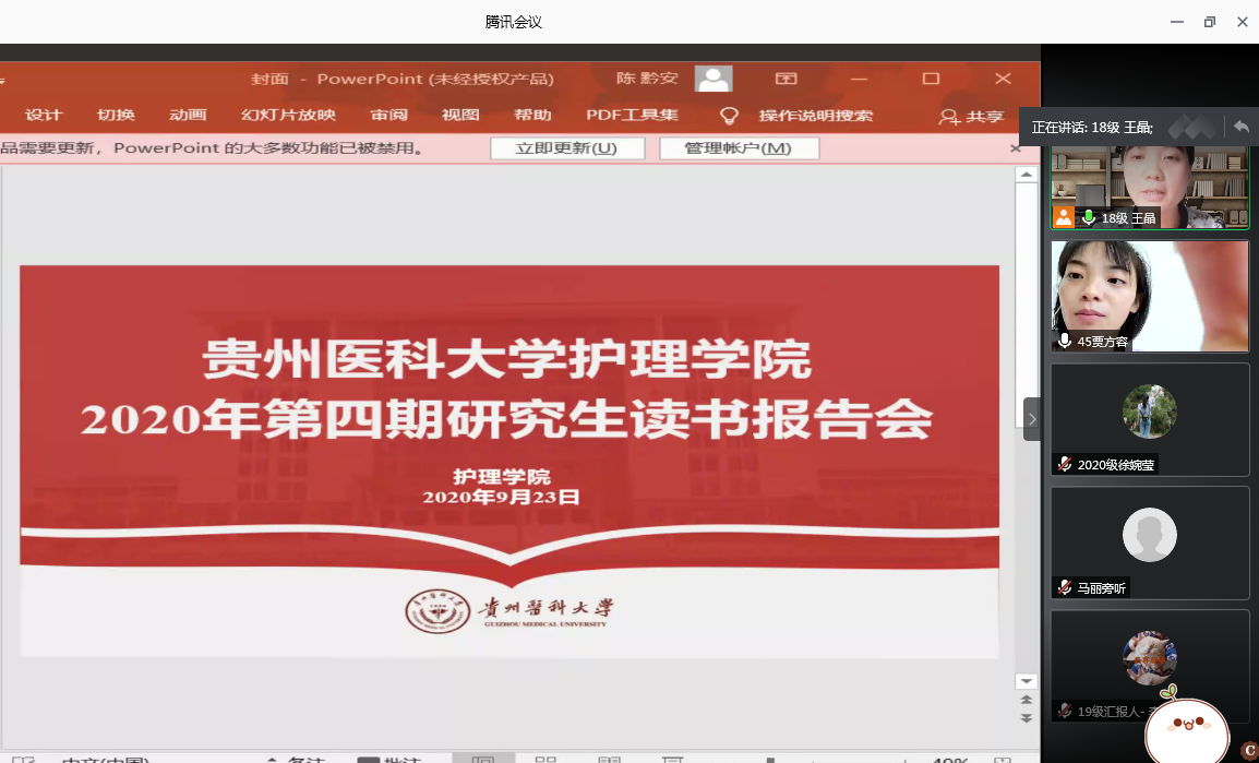 本次读书报告会由2018级老年保健与护理方向研究生王晶主持。读书报告会分为研究生汇报和师生点评两个部分进行。首先由2019级研究生李均凤、邵丽梅、唐帆3位同学以PPT的形式进行分享。随后参会老师和同学对3位同学的汇报逐一进行点评,为学生提出建设性意见,提供专业性指导,展开讨论交流。