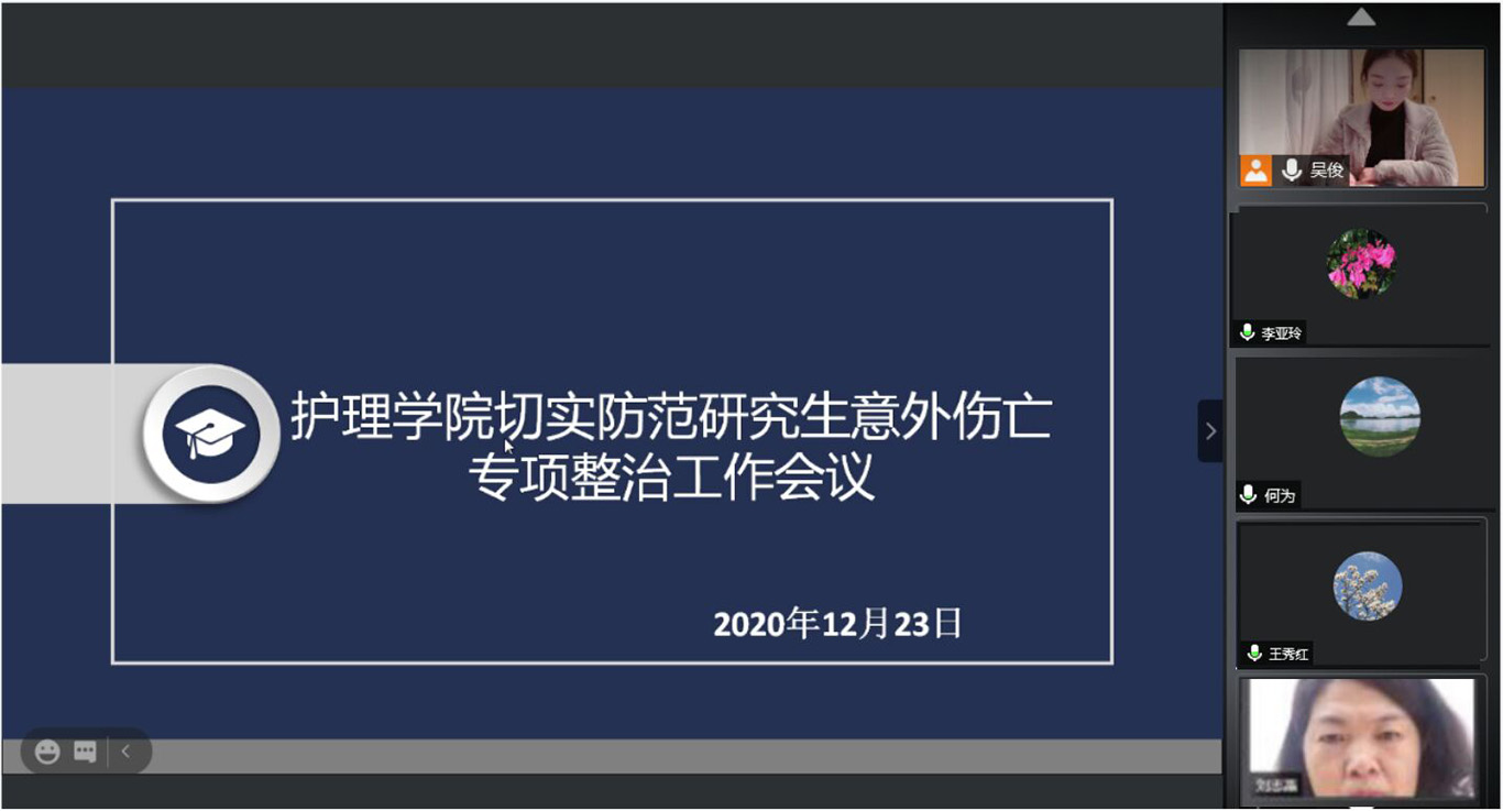 12月23日晚,为认真贯彻落实党中央和省委、省政府、省教育厅的重要批示精神,预防和减少研究生意外伤害事故的发生,按照kaiyun开云官方网站党委研究生工作部和学校下发文件。在腾讯会议上召开关于kaiyun开云官方网站防范研究生意外伤亡专项整治工作的会议。该会议由kaiyun开云官方网站2020级辅导员吴俊主持,党委委员、院长李亚玲,党委委员、副书记何为,党委委员、副院长王秀红以及全体研究生意外伤亡专项工作小组成员参加。