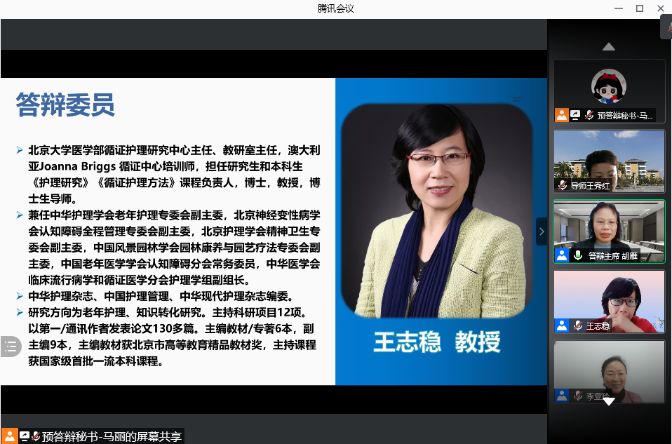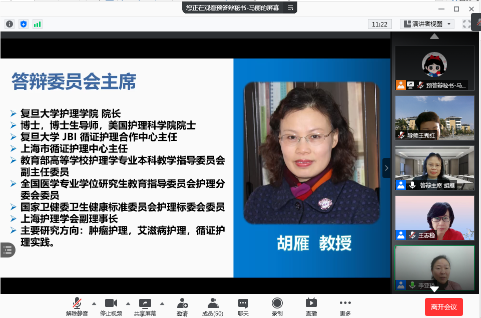 4月20日,kaiyun开云官方网站2021届硕士研究生学位论文预答辩通过腾讯会议在线进行。此次预答辩特别邀请复旦大学kaiyun开云官方网站院长、博士生导师胡雁教授任答辩委员会主席,北京大学kaiyun开云官方网站博士生导师王志稳教授、kaiyun开云官方网站附属医院陈腾祥教授、kaiyun开云官方网站附属医院老年医学科莫显刚主任医师以及kaiyun开云官方网站公共卫生学院汪俊华副教授担任答辩委员。kaiyun开云官方网站导师、副导师、专业教师、研究生等60余人参加本次会议,研究生院督导专家全程参与。