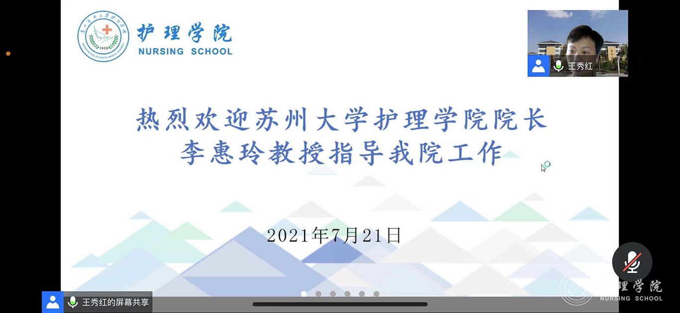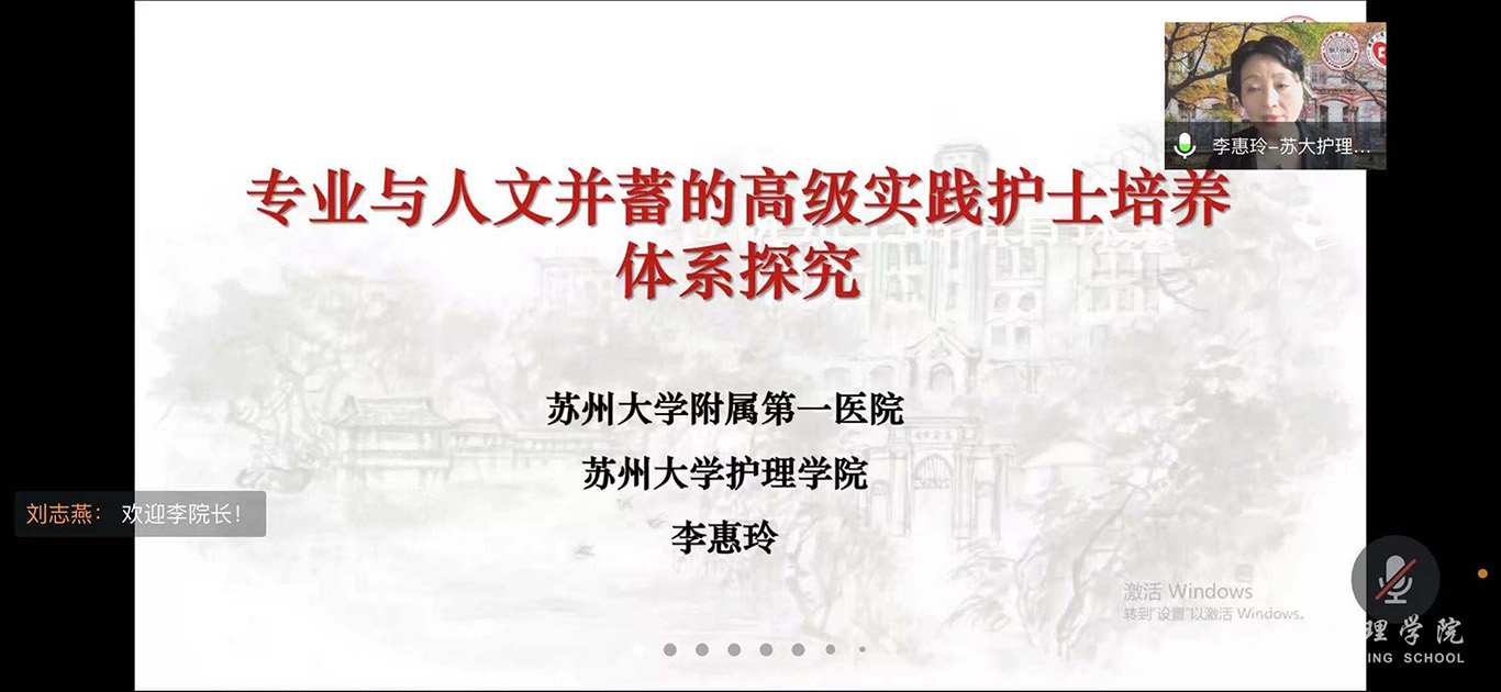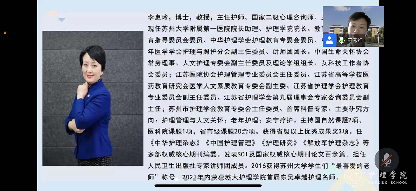 为进一步推进我校护理学科内涵建设,提升我校护理专硕研究生培养质量,7月21日,kaiyun开云官方网站特邀苏州大学附属第一医院院长助理、kaiyun开云官方网站院长李惠玲教授为师生开展了题为《专业与人文并蓄的高级实践护士培养体系探究》的专题讲座,并进行指导。讲座和指导通过腾讯会议进行,kaiyun开云官方网站党委委员、副院长刘志燕、附属医院护理部副主任蔡鹏、顾颖及研究生导师、副导师、学院和附院相关教师及研究生共计110余人参加,kaiyun开云官方网站党委委员、副院长王秀红主持活动。