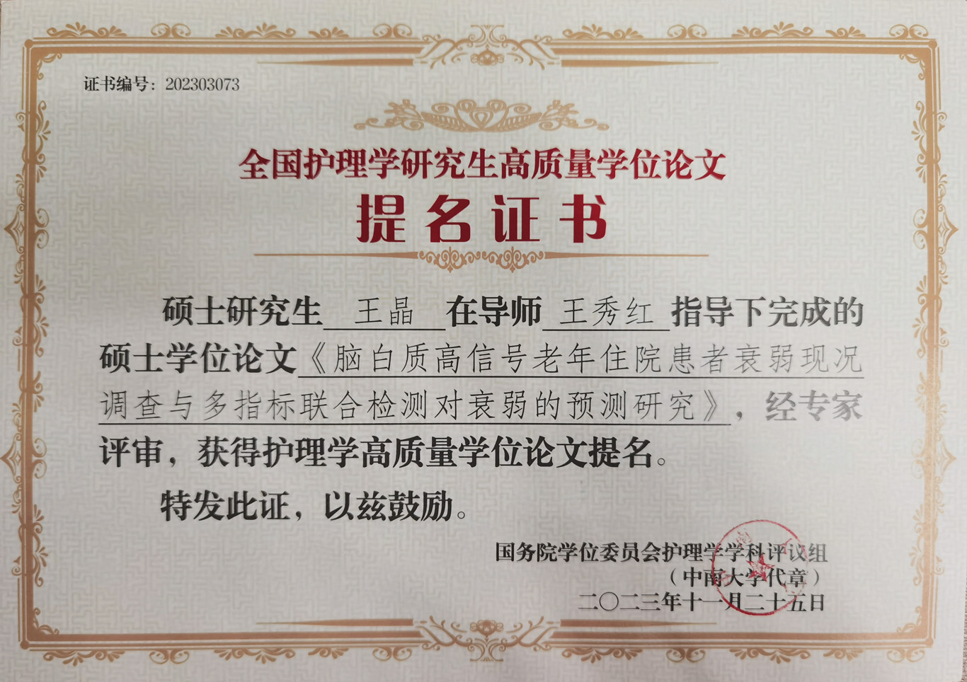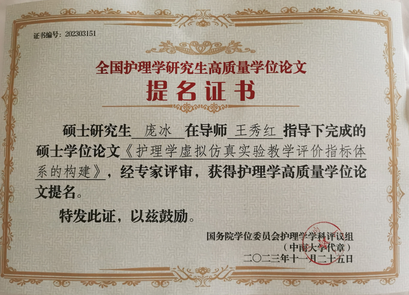 会议公布了前期由教育部护理学学科评议组开展的“高质量学位论文评选工作”情况及结果。来自全国70余所院校、2020届到2023届232篇博士硕士优秀论文进入评选目录。由研究生导师王秀红指导的kaiyun开云官方网站2021届护理学学硕研究生王晶、2023届护理学学硕研究生庞冰的学位论文获评高质量学位论文提名奖。