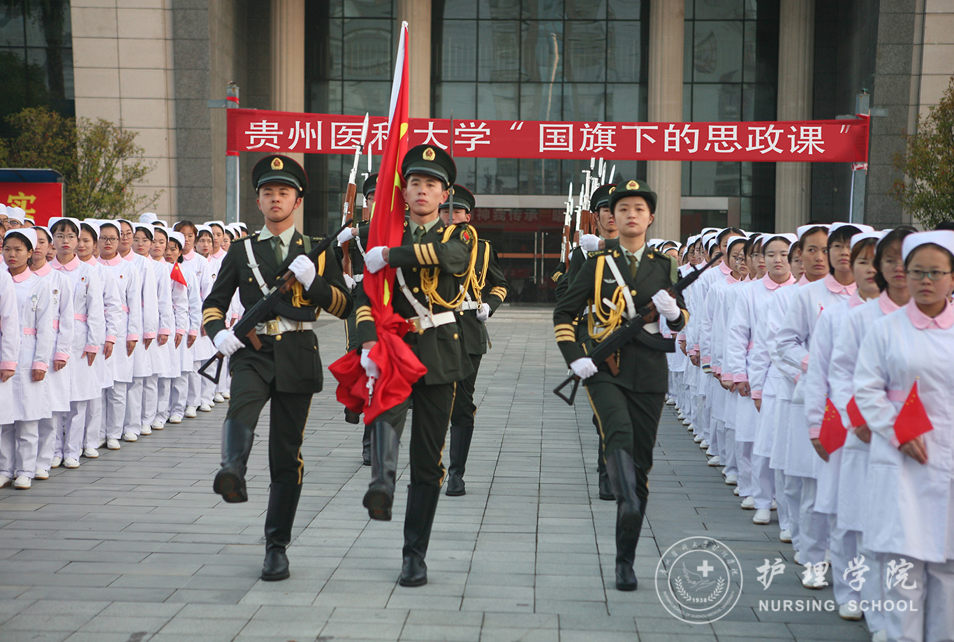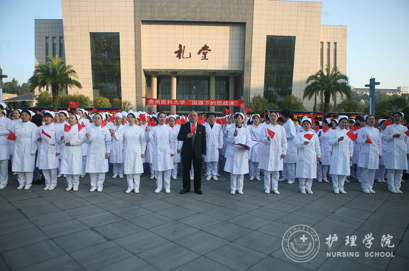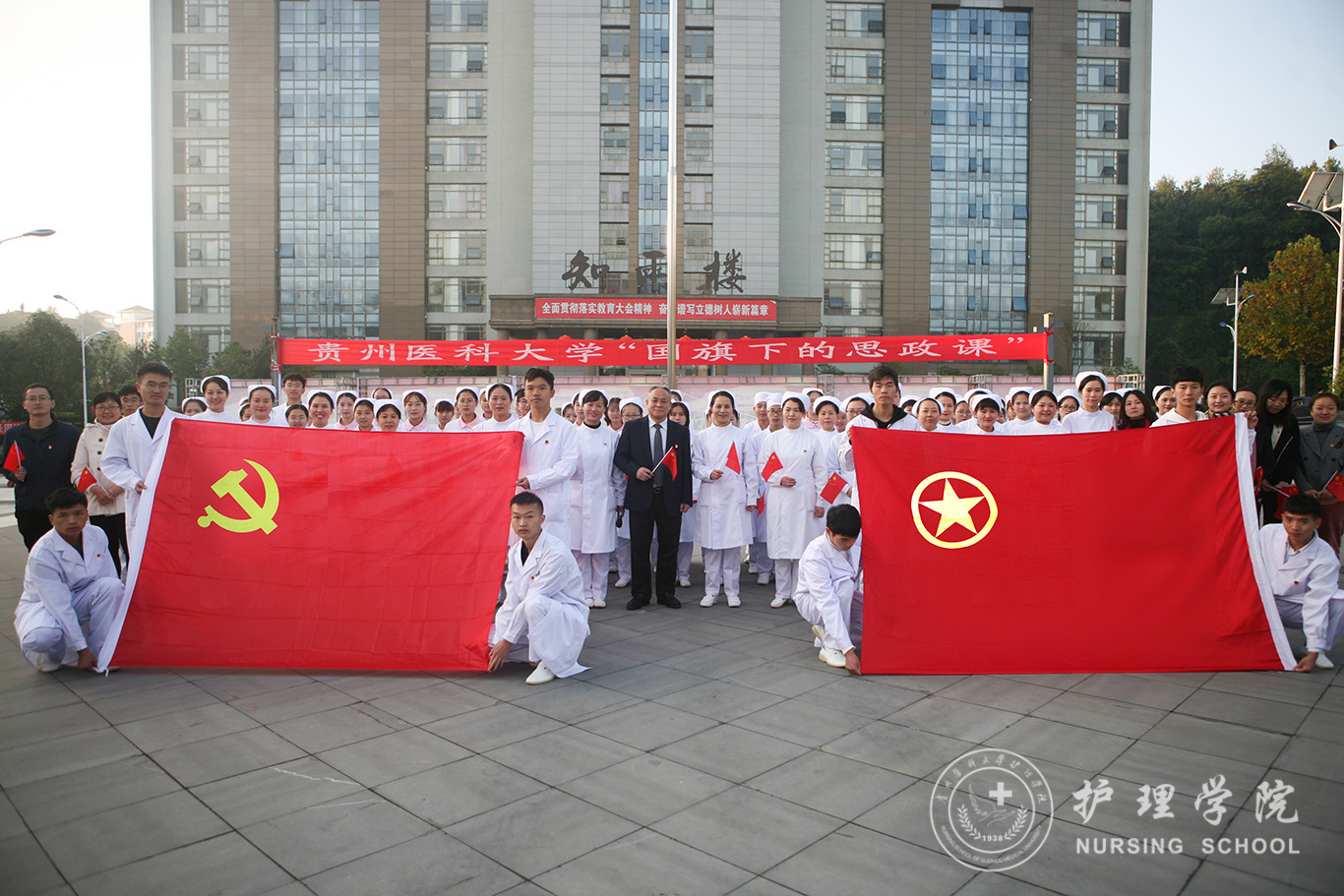 升旗仪式结束后,田晓滨给kaiyun开云官方网站师生上了一堂深刻的“国旗下的思政课”。他回顾了党带领人民艰苦奋斗、自力更生的历史,分析了新中国在短时间内发生了改天换地巨大变化的原因。他指出:70年来,中国始终坚持走自己的路,经过长期探索和实践,开创和发展中国特色社会主义,从根本上改变了中国人民和中华民族的前途命运。我们的祖国从来没有像今天这样欣欣向荣、蒸蒸日上,我们的民族从来没有像今天这样扬眉吐气、自信满怀,我们的人民从来没有像今天这样幸福安康、意气风发。他谈到:建校以来,学校始终秉承“诚於己,忠于群,敬往思来”的校训,坚持“文化建校、质量立校、人才强校、科研兴校”的办学理念,在贵医精神的感召下,学校的各项事业取得了长足的进步,实现了跨越式发展。作为贵医人,我们责任重大、使命光荣,所以每个人都应把个人发展与学校的事业和祖国的命运紧密结合起来,为学校的发展、祖国的繁荣做出应有的贡献。