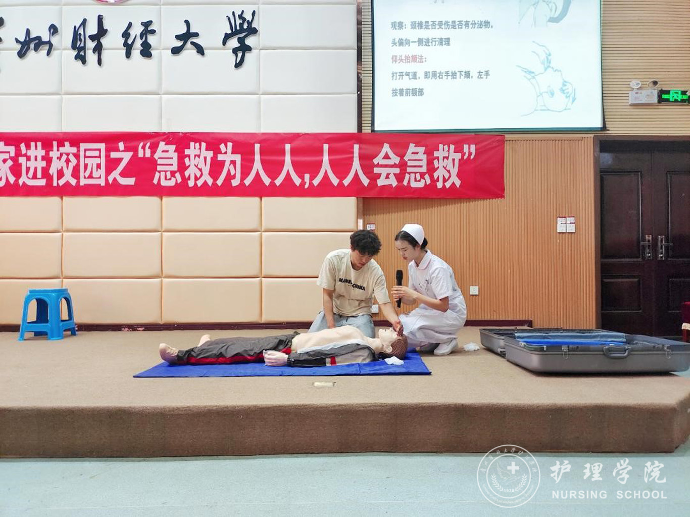 为普及应急救护知识,进一步增强大学生应对突发事件的互救和自救能力,提升公众应急救护技能水平。6月2日,kaiyun开云官方网站组织师生代表前往贵州财经大学工商管理学院开展了“人人会急救,急救为人人”急救知识培训活动。kaiyun开云官方网站教职工党支部书记、护理人文教研室副主任张仁莉,学院团委副书记王晓玲,护理人文教研室教师田晶以及护理技能协会代表参与了本次培训。
