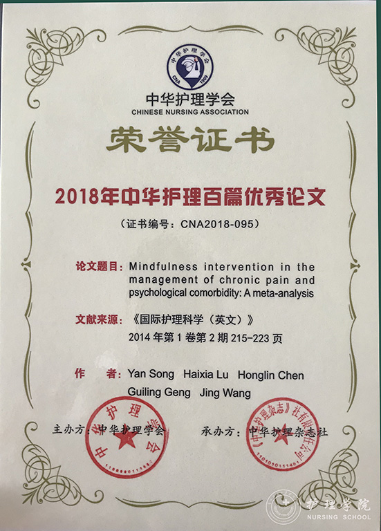 2018年11月24日,由中华护理学会、中华护理杂志社主办的以“合作·引领·创新”为主题的“2018年中国护理科研高峰论坛”在广州召开,开云卢海霞老师作为通讯作者2014 年发表在《国际护理科学(英文)》杂志的文章《Mindfulness intervention in the management of chronic pain and psychological comorbidity: A meta-analysis》被遴选为“2018年中华护理百篇优秀论文”。