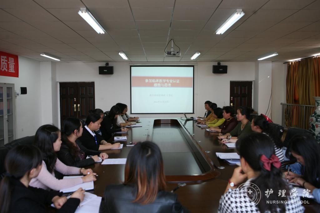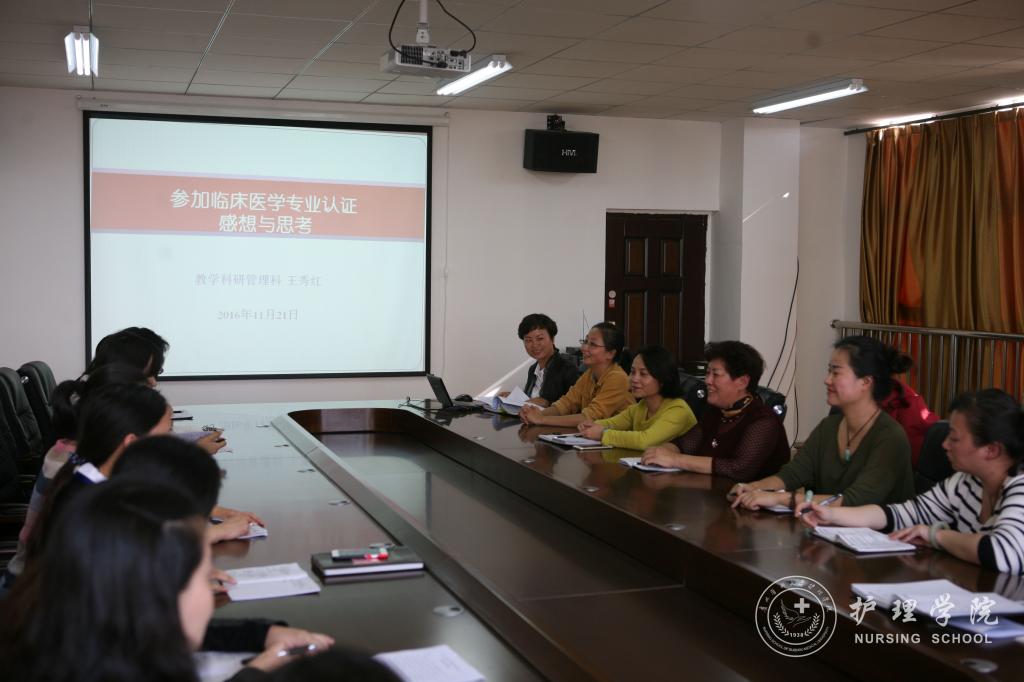 紧接着王秀红科长分享了她参加11月14日-17日我校临床医学专业认证工作的感想和思考。通过多天的跟随走访,了解到认证工作中专家的实地考察的内容和重点。观摩了校本部理论和实验教学课、附属医院的指导操作教学查房、病例讨论等教学活动。结合临床和护理专业认证标准,王秀红科长从宗旨与目标、教育计划、学生成绩评定等十个方面对跟随走访过程中的要素进行了全面分析,并结合即将进行的本科教学审核评估工作、护理专业认证工作提出kaiyun开云官方网站的整改建议和努力方向,进一步明确和强化了教学实施过程及相关管理要求,为真正落实“以评促建、以评促改、以评促管、评建结合、重在建设”核心方针,突出内涵建设、强化内部质量保障体系建设树立牢固基础。