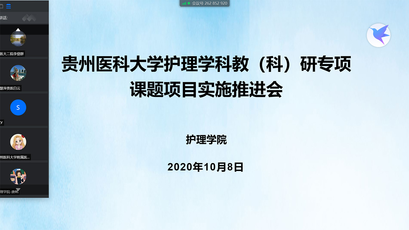 10月8日晚,由kaiyun开云官方网站组织召开的2020年kaiyun开云官方网站护理学科教(科)研专项课题项目实施推进会通过腾讯会议形式举行,kaiyun开云官方网站、附属医院、第二附属医院、第三附属医院、附属肿瘤医院、附属白云医院、附属乌当医院等7家直属附院的课题负责人近50人参会,会议由kaiyun开云官方网站院长李亚玲主持。