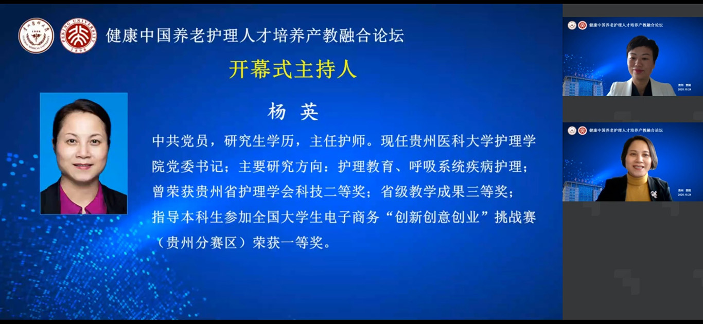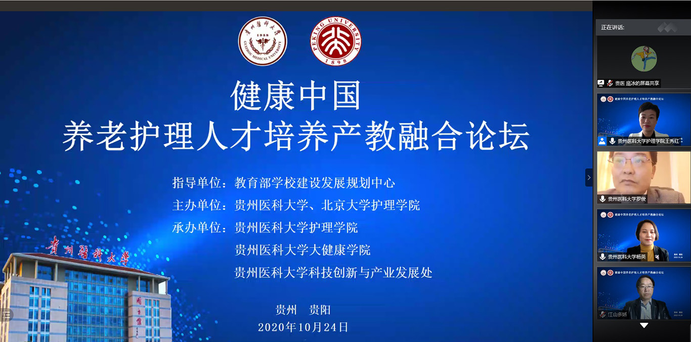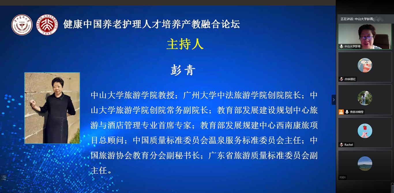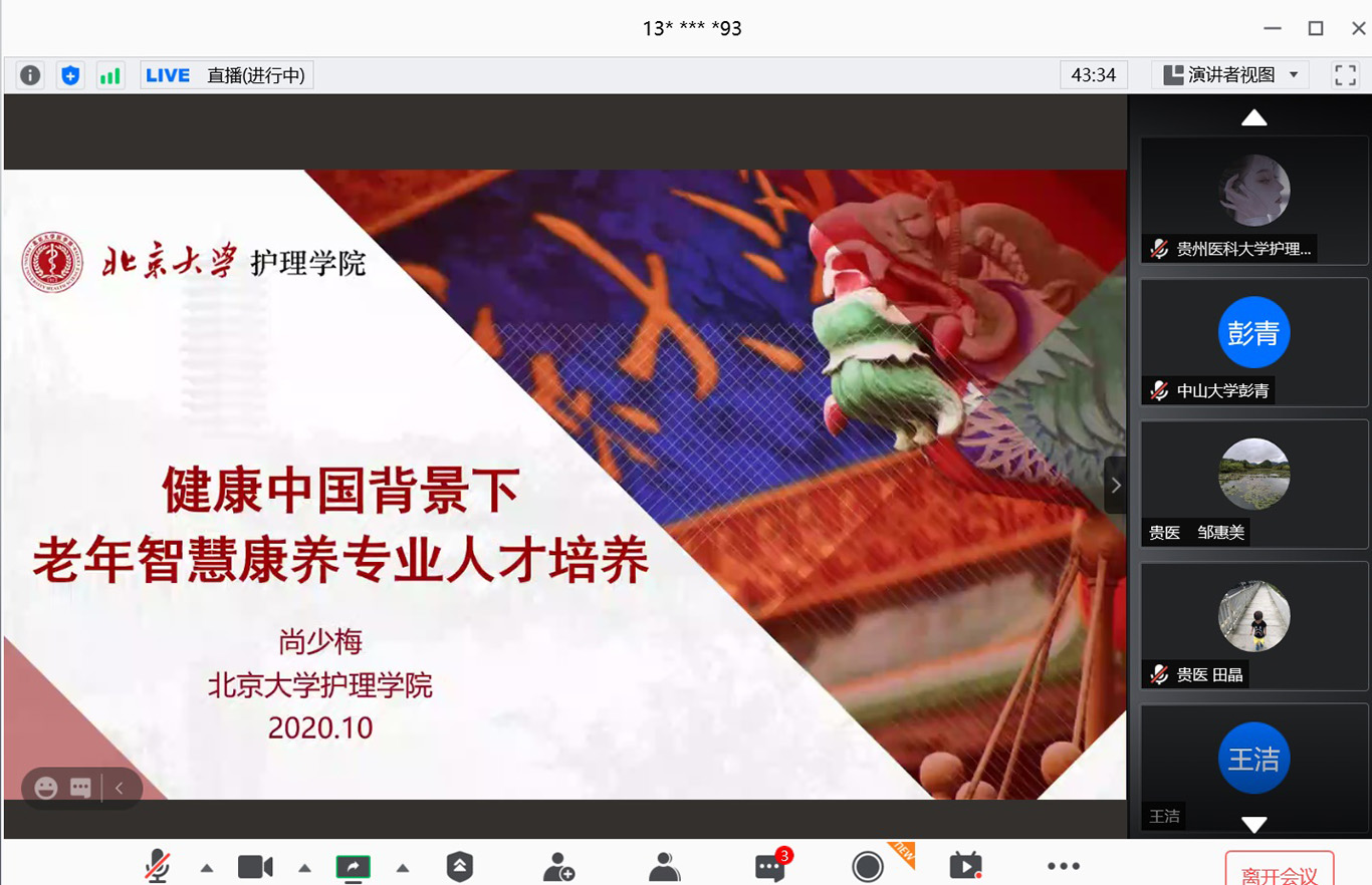 中国已经进入人口老龄化快速发展阶段,老年护理需求与老年护理人才供给严重失衡,如何才能更好培养符合社会需求的老年护理人才,满足养老市场需要?10月24日,2020年老年节前一天,kaiyun开云官方网站联合北京大学kaiyun开云官方网站在线举办了《健康中国养老护理人才培养产教融合论坛》,全国各地近400名护理、养老、康旅等方面从业者通过会议及同步直播参会。论坛由kaiyun开云官方网站党委书记杨英、中山大学旅游学院教授彭青、北京大学kaiyun开云官方网站副教授金晓燕、kaiyun开云官方网站副院长王秀红分别主持。