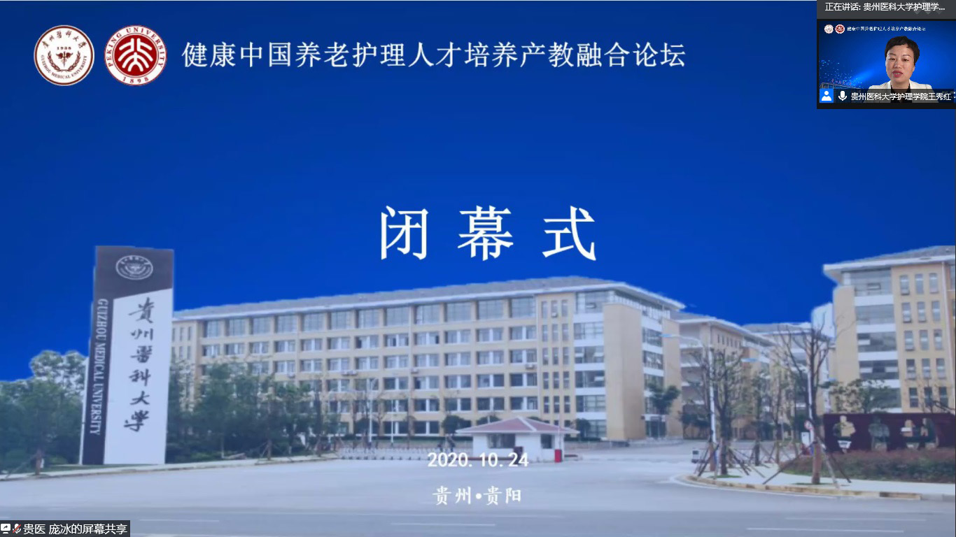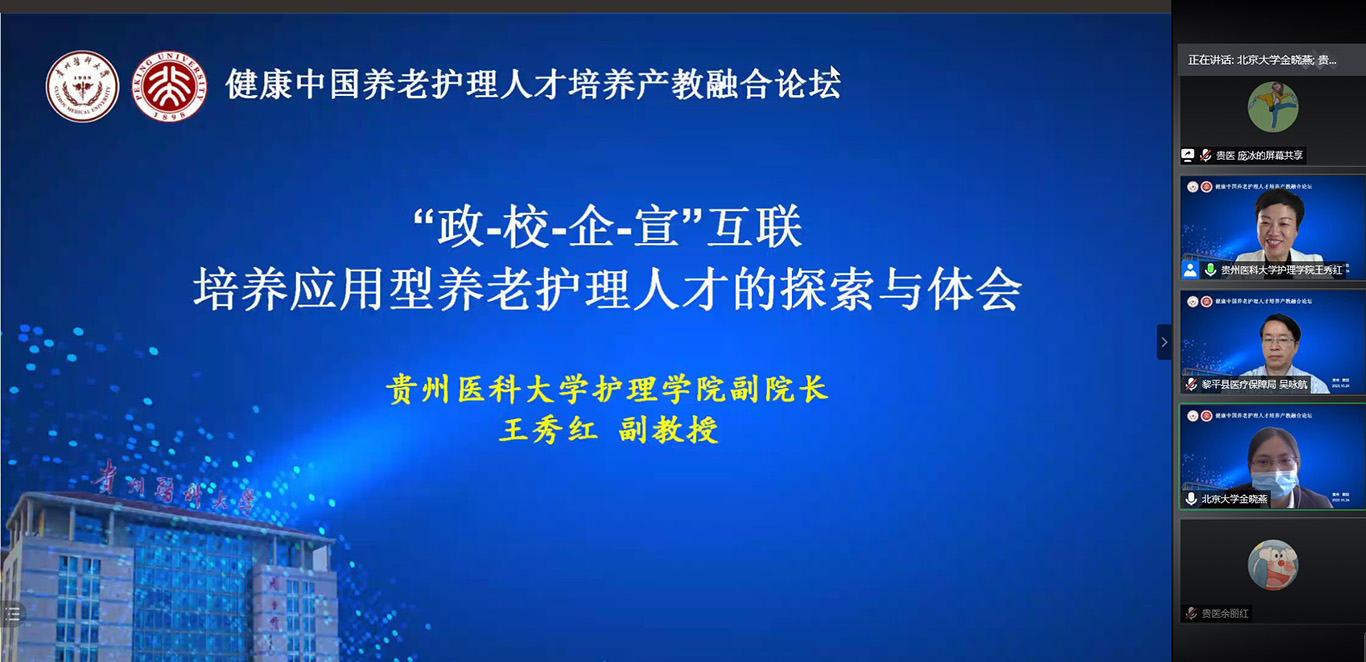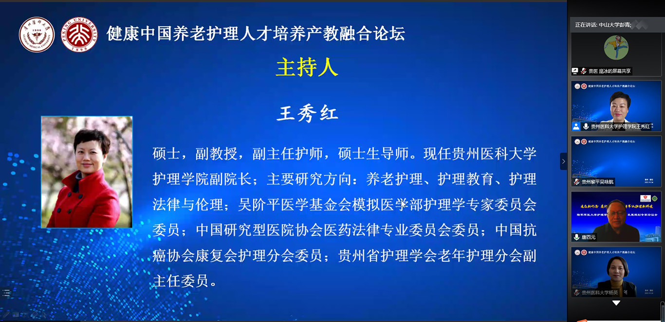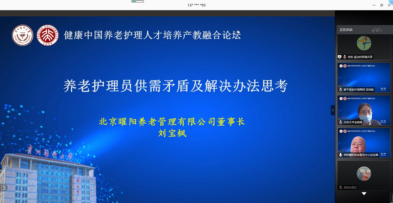 中国已经进入人口老龄化快速发展阶段,老年护理需求与老年护理人才供给严重失衡,如何才能更好培养符合社会需求的老年护理人才,满足养老市场需要?10月24日,2020年老年节前一天,kaiyun开云官方网站联合北京大学kaiyun开云官方网站在线举办了《健康中国养老护理人才培养产教融合论坛》,全国各地近400名护理、养老、康旅等方面从业者通过会议及同步直播参会。论坛由kaiyun开云官方网站党委书记杨英、中山大学旅游学院教授彭青、北京大学kaiyun开云官方网站副教授金晓燕、kaiyun开云官方网站副院长王秀红分别主持。