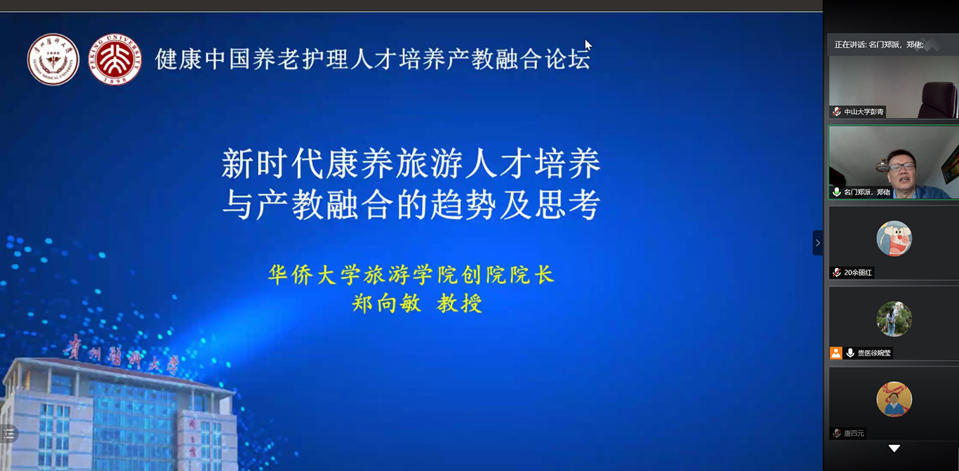 现任华侨大学国家级旅游实验中心主任,中国旅游研究院旅游安全研究基地主任郑向敏教授以“新时代康养旅游人才培养与产教融合的趋势及思考”为题发表见解。他将养老与旅游行业相结合,分析当前国内老年人康养状况,提出一系列旅游、养老的相关理念,并详细介绍了产教融合康养旅游人才培养课程设置与改革,为养老护理应用型人才的培养提供了重要的参考。