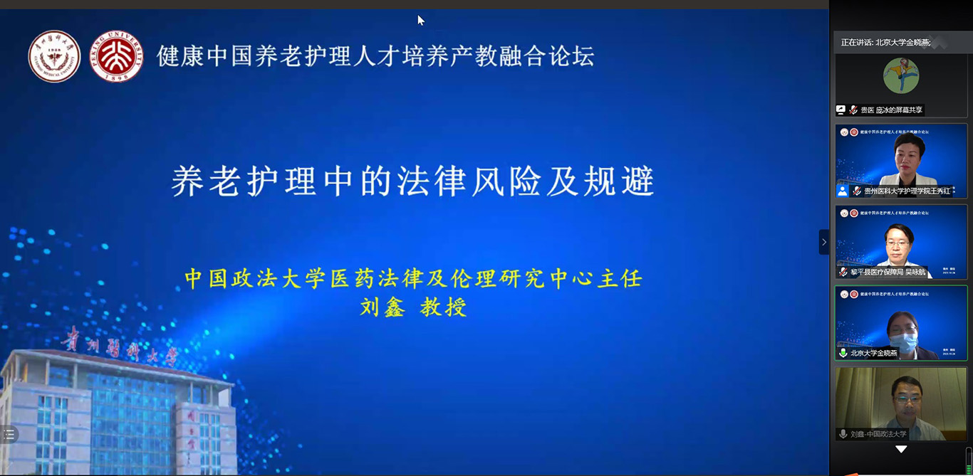 中国政法大学医药法律与伦理研究中心主任刘鑫教授以“养老护理中的法律风险及规避”为题,从养老护理法律风险概述、养老护理法律问题、养老护理特殊问题法律风险、养老护理中如何规避风险等几个方面结合《民法典》进行了深入浅出的讲授,为养老护理从业者做了一场精彩的普法报告。