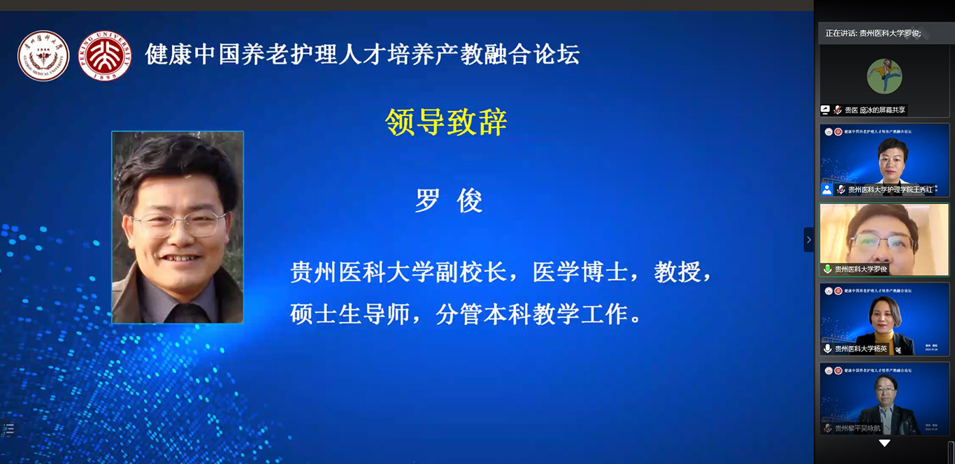 论坛开幕式上kaiyun开云官方网站副校长罗俊教授代表学校对此次论坛的召开表示热烈的祝贺,对参会专家表示热烈欢迎和感谢,并对kaiyun开云官方网站历史沿革和发展现况做了简要的介绍,同时对贵医人在抗击新冠肺炎疫情中救死扶伤、大爱无疆的精神和多年来服务地方、博济四方,致力于医疗卫生人才培养和助力基层卫生服务和养老护理服务等工作做了概况性介绍。