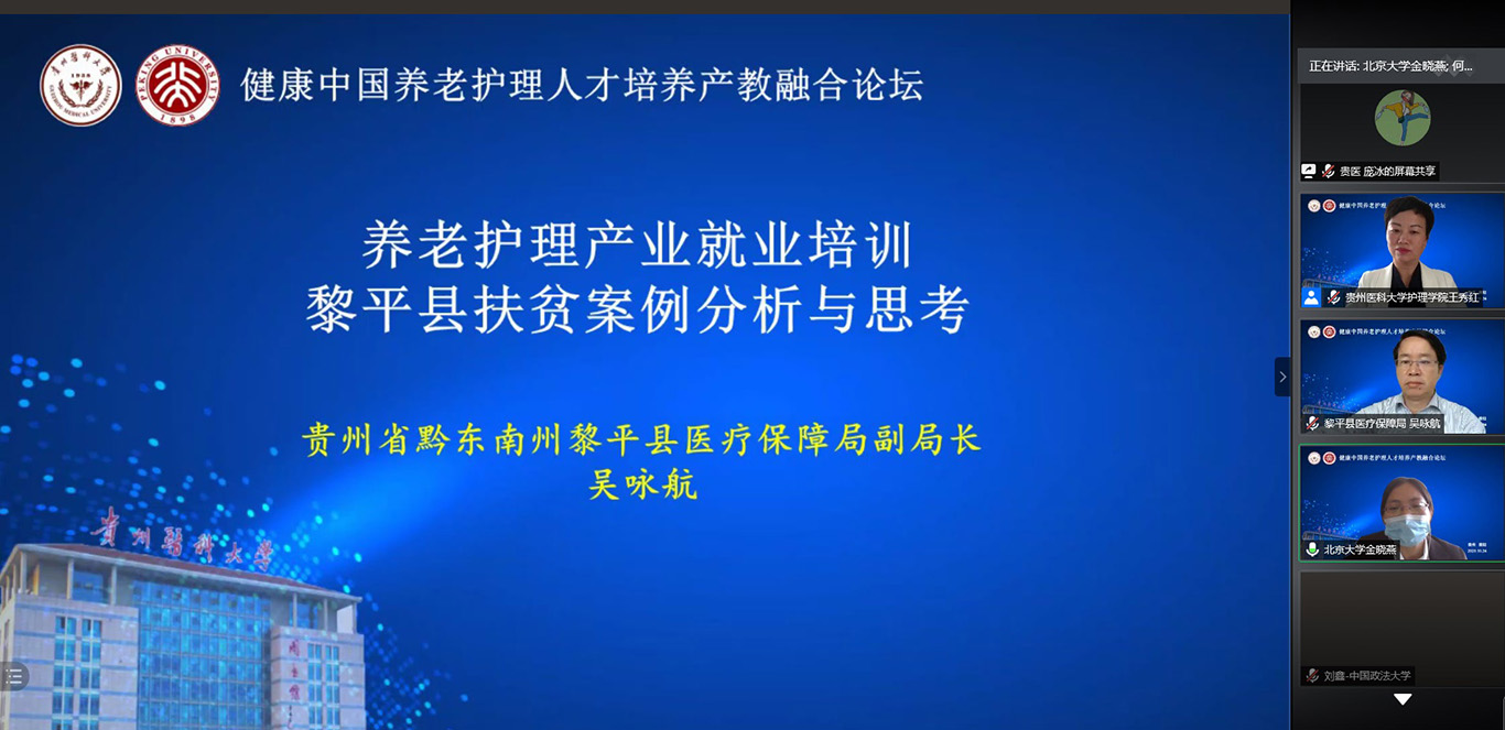 贵州省黔东南州黎平县医疗保障局副局长吴咏航分享了养老护理产业扶贫工作经验。他以视频的方式进行铺垫,生动地讲述了黎平县是如何将养老护理员培训与脱贫攻坚工作相结合,通过联合kaiyun开云官方网站优质的高校师资和设备资源帮助黎平乡镇少数民族贫困人口脱贫的同时学到一技之长,改变就业观念的故事。