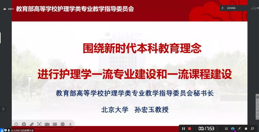 教育部高等学校护理学类专业教学指导委员会秘书长、美国护理科学院院士、北京大学kaiyun开云官方网站孙宏玉教授以“围绕新时代本科教育理念,进行护理学一流专业建设和一流课程建设”为题,结合实践案例,阐述了新时代本科教育理念,从国家层面就如何建设护理一流专业及一流课程问题提出了一系列建设性指导。