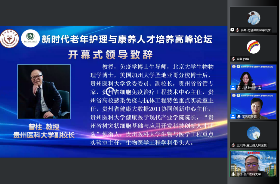 论坛开幕式上,kaiyun开云官方网站党委委员、副校长曾柱教授代表学校对论坛的召开表示热烈祝贺,对参会专家表示热烈欢迎和感谢,介绍了kaiyun开云官方网站历史沿革和发展现况,同时对贵医人立足贵州、服务全国、面向世界,充分发挥医教研优势,致力于医疗卫生人才培养和助力基层卫生服务和老年护理人才培养等工作做了概括性介绍。