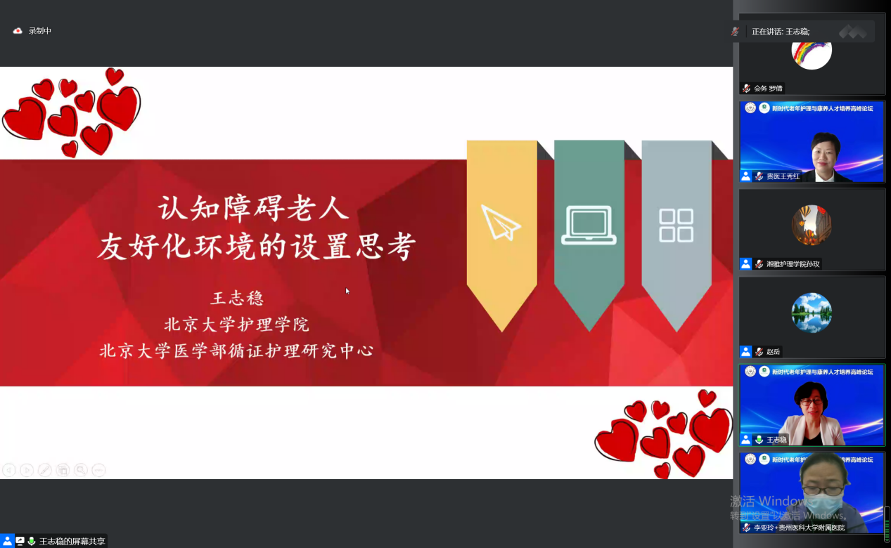 北京大学医学部循证护理研究中心主任王志稳教授以“认知障碍老人友好化环境的设置思考”为题,生动细致地展示了认知障碍老年人日常照护过程中友好化环境的设置,她表示,将研究证据更好的地转化并应用到实践的过程中,跨学科交叉研究以科技赋能失智照护,推动护理学科发展、造福人类健康是护理人应该不断追求的方向。
