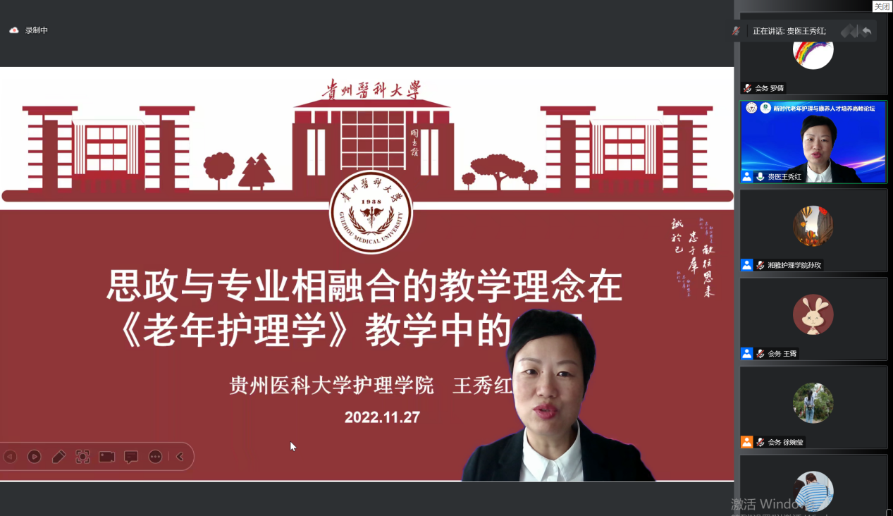我校kaiyun开云官方网站副院长王秀红副教授以“思政与专业相融合的教学理念在《老年护理学》教学中的应用”为题,分享了在《老年护理学》课程教学实施过程中要明确老年护理“为谁培养人?培养什么样的人?如何培养人?”三个核心问题,以立德树人为根本,通过“四贯通一并举”将思政与专业相融合的教学改革的策略及方法有效应用于教学中。