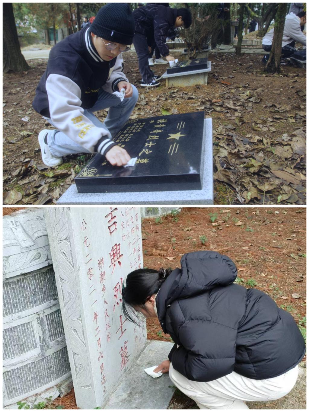 首先,刘文壮组织在场人员进行集体默哀,共同缅怀南京大屠杀遇难同胞和为抗战胜利牺牲的革命先烈,号召全体同学铭记历史、珍爱和平。随后,学生代表付知行带领大家回顾了南京大屠杀这段沉痛的历史,讲解了中华民族抗日战争的艰难历程以及“国家公祭日”设立的意义及背景;杨显芳、付知行、杨烨锋三位学生代表对此次活动的感想进行了交流,用青年的朴实话语表达对遇难同胞和革命烈士的深切缅怀。到场师生在革命烈士纪念碑前进行了庄严肃穆的献花仪式,并有序瞻仰烈士陵园,为陵园内的烈士擦拭墓碑,用实际行动表达了对革命烈士的无限敬仰和悼念之情。
